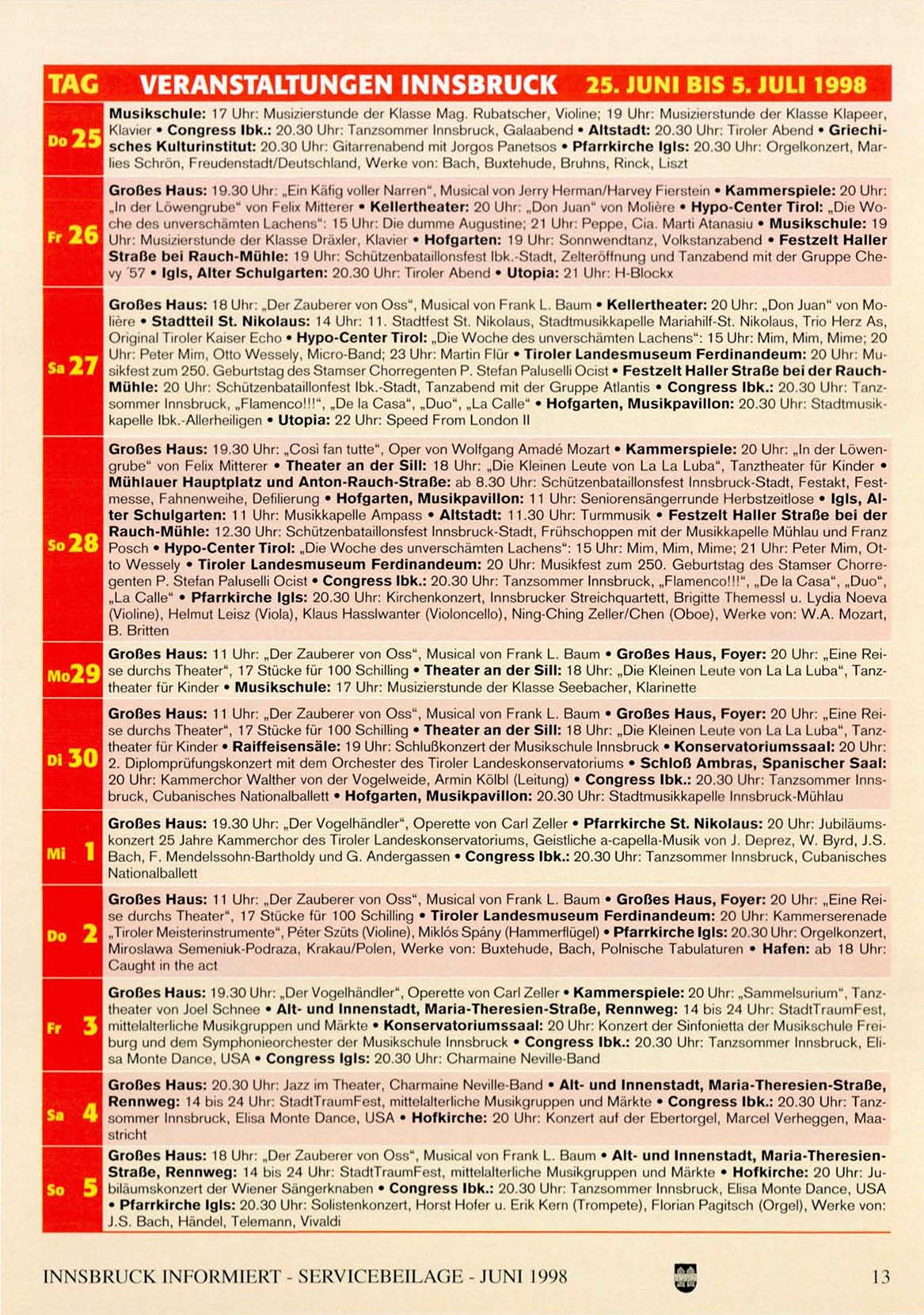 Großes Haus: 11 Uhr: „Der Zauberer von Oss", Musical von Frank L. Baum • Großes Haus, Foyer: 20 Uhr: „Eine Reise durchs Theater", 17 Stücke für 100 Schilling • Theater an der Sill: 18 Uhr: „Die Kleinen Leute von La La Luba", Tanztheater für Kinder • Raiffeisensäle: 19 Uhr: Schlußkonzert der Musikschule Innsbruck • Konservatoriumssaal: 20 Uhr: