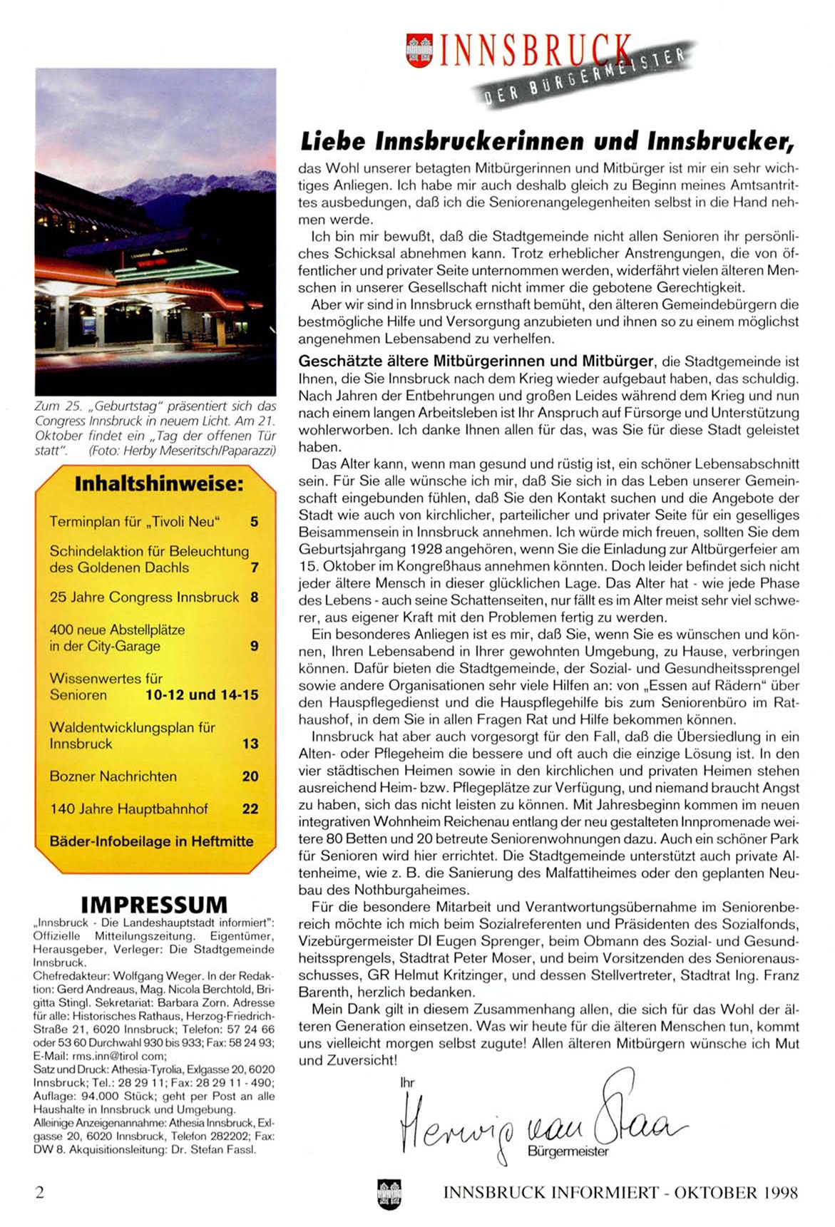 das Wohl unserer betagten Mitburgerinnen und Mitburger ist mir em sehr wichtiges Anliegen. Ich habe mir auch deshalb gleich zu Beginn meines Amtsantrittes ausbedungen, daB ich die Seniorenangelegenheiten selbst in die Hand nehmen werde.