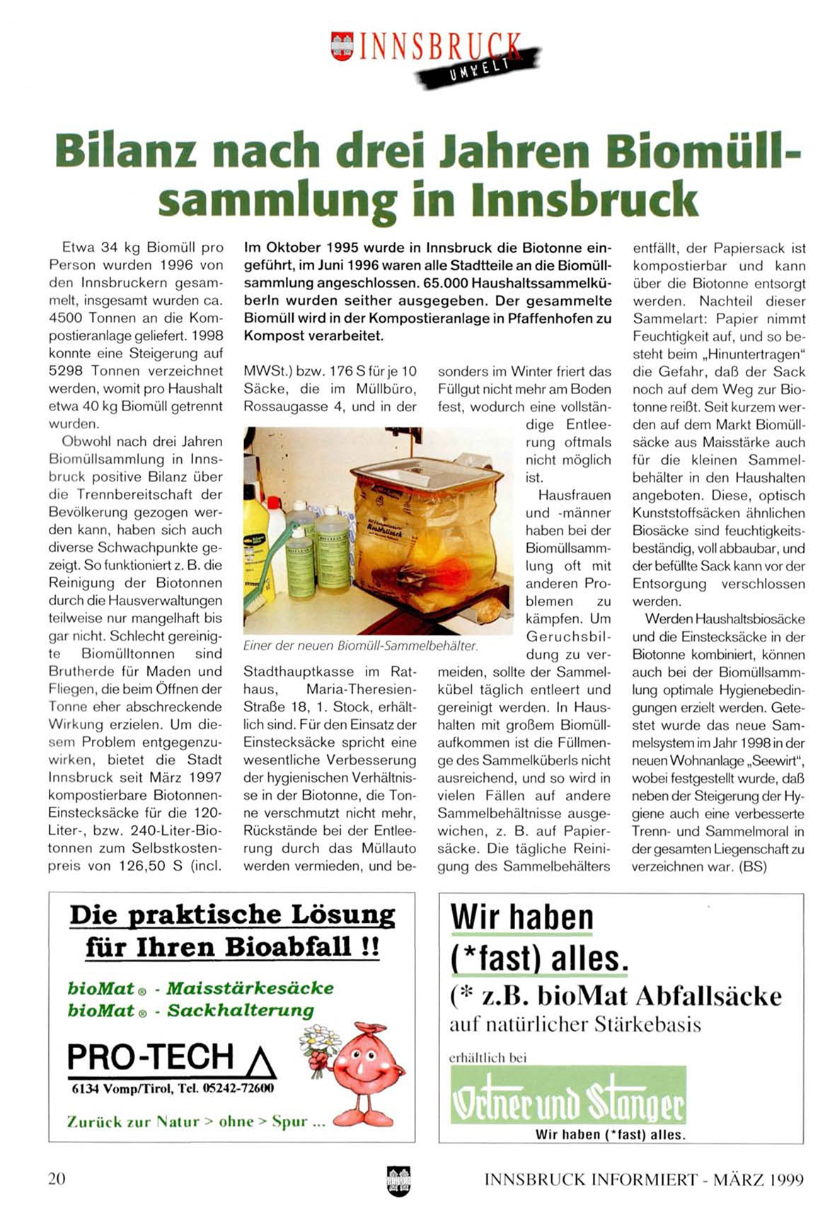 Im Oktober 1995 wurde in Innsbruck die Biotonne eingeführt, im Juni 1996 waren alle Stadtteile an die Biomüllsammlung angeschlossen. 65.000 Haushaltssammelküberln wurden seither ausgegeben. Der gesammelte