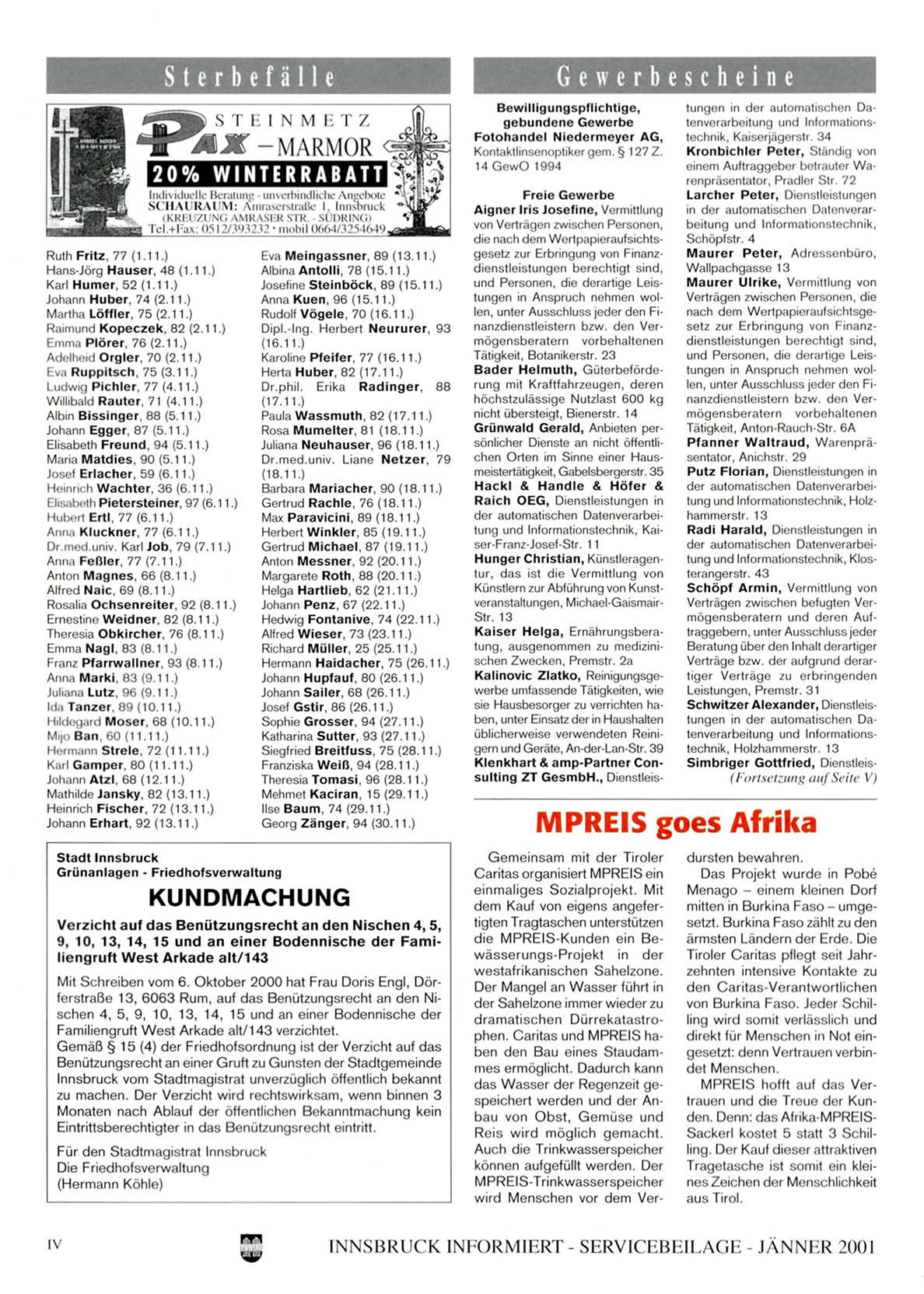 Mit Schreiben vom 6. Oktober 2000 hat Frau Doris Engl, Dörferstraße 13, 6063 Rum, auf das Benützungsrecht an den Nischen 4, 5, 9, 10, 13, 14, 15 und an einer Bodennische der