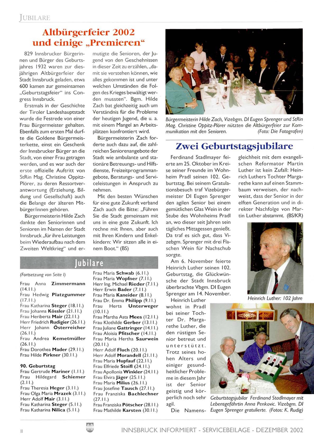 Ferdinand Stadimayer feierte am 25. O k t o b e r im Kreise seiner Freunde im W o h n heim Pradl seinen 102. Geburtstag. Bei seinem Gratulationsbesuch traf Vizebürgermeister DI Eugen Sprenger