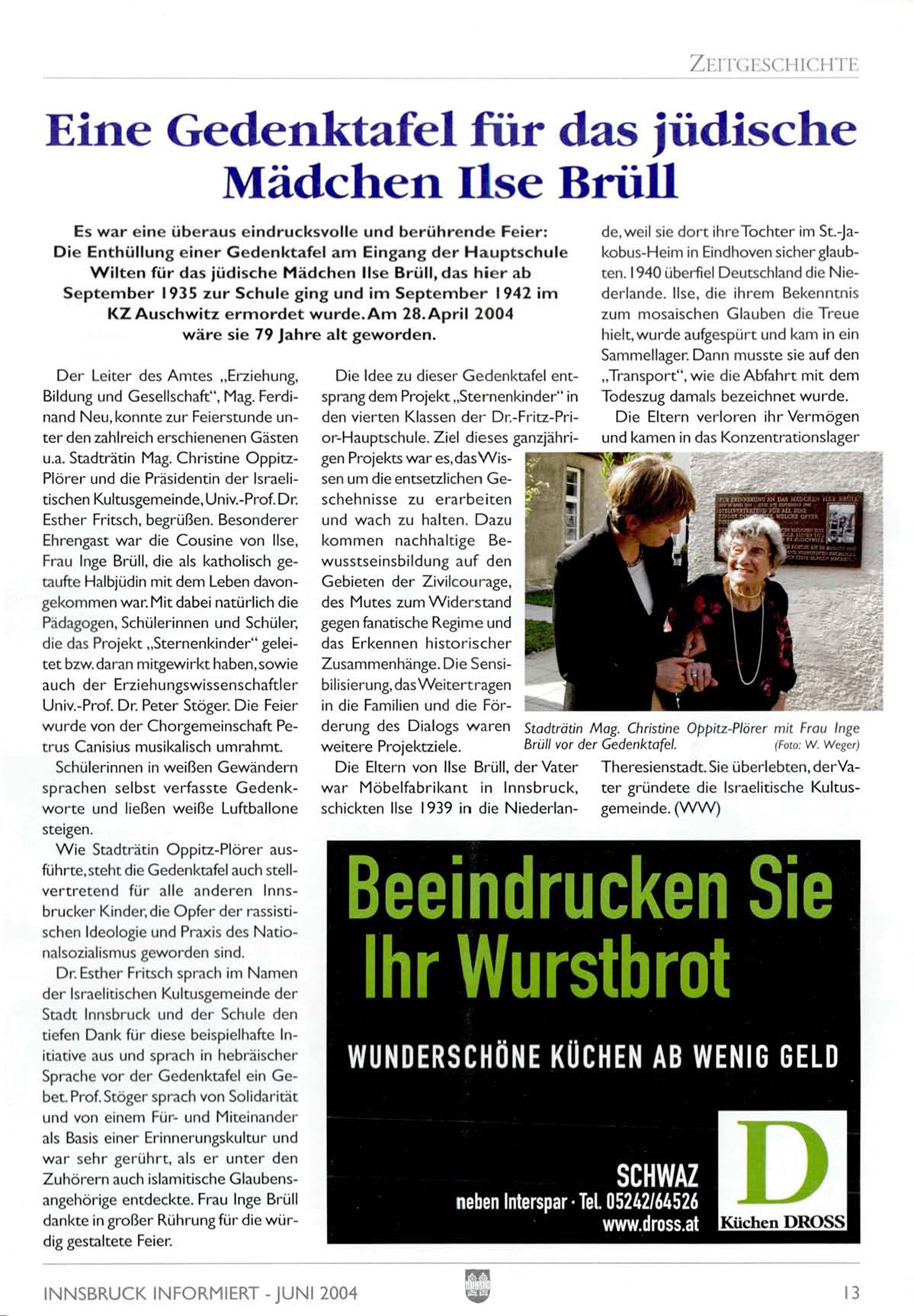 W i e Stadträtin Oppitz-Plörer ausführte, steht die Gedenktafel auch stellvertretend für alle anderen Innsbrucker Kinder, die Opfer der rassistischen Ideologie und Praxis des Nationalsozialismus geworden sind.