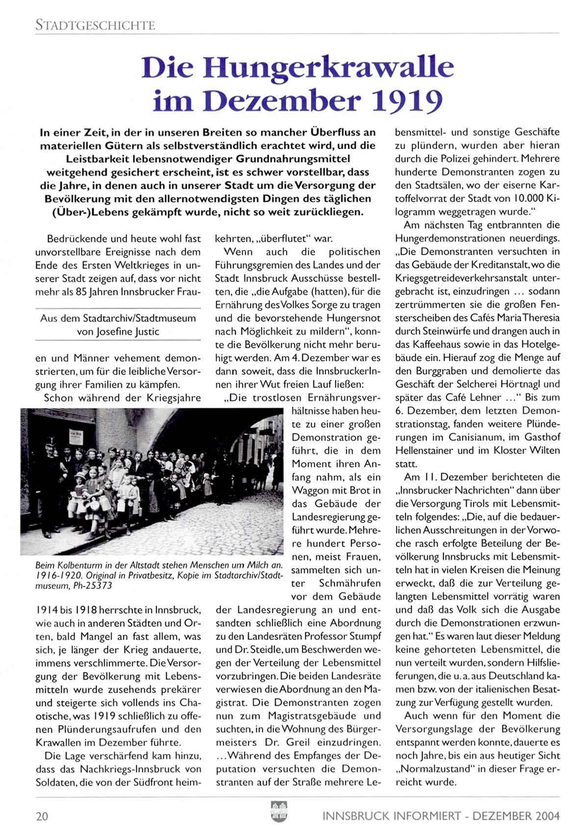 die Versorgung Tirols mit Lebensmitteln folgendes: „Die, auf die bedauerlichen Ausschreitungen in der Vorwoche rasch erfolgte Beteilung der Bevölkerung Innsbrucks mit Lebensmitteln hat in vielen Kreisen die Meinung