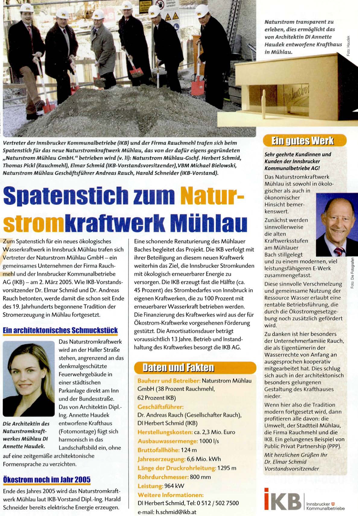 Ende des Jahres 2005 wird das Naturstromkraftwerk Mühlau laut IKB-Vorstand Dipl. Ing. Harald