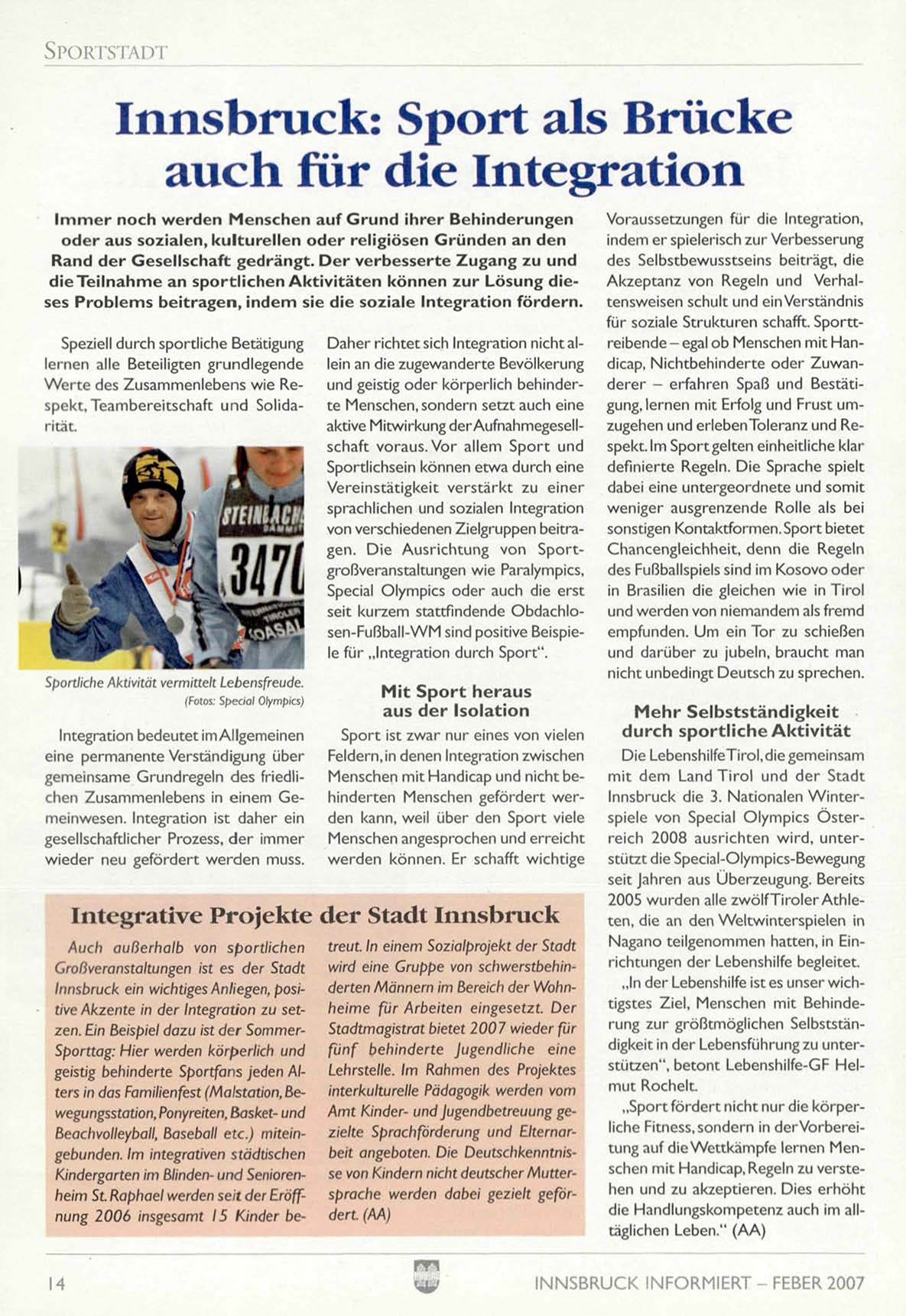 Innsbruck die 3. Nationalen Winterspiele von Special Olympics Österreich 2008 ausrichten w i r d , unterstützt die Special-Olympics-Bewegung