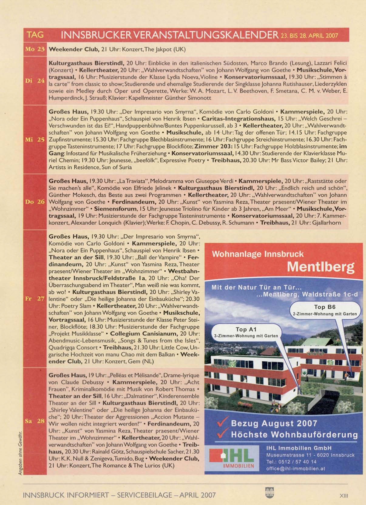 INNSBRUCKER VERANSTALTUNGSKALENDER 23. BIS 2a APRIL 2007