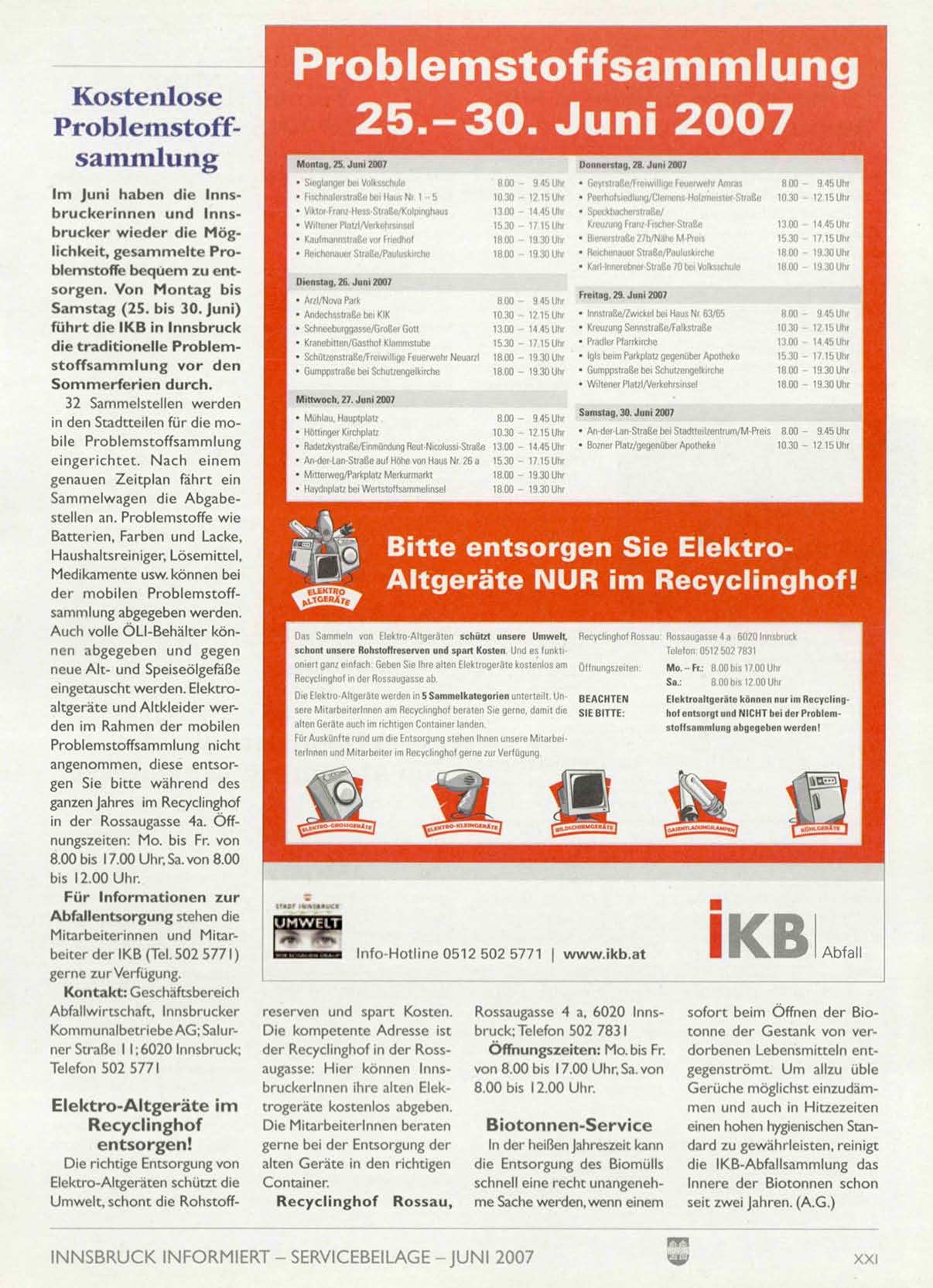 I m Juni h a b e n d i e I n n s b r u c k e r i n n e n und Innsb r u c k e r w i e d e r die M ö g lichkeit, gesammelte Problemstoffe b e q u e m zu ents o r g e n . V o n M o n t a g bis
