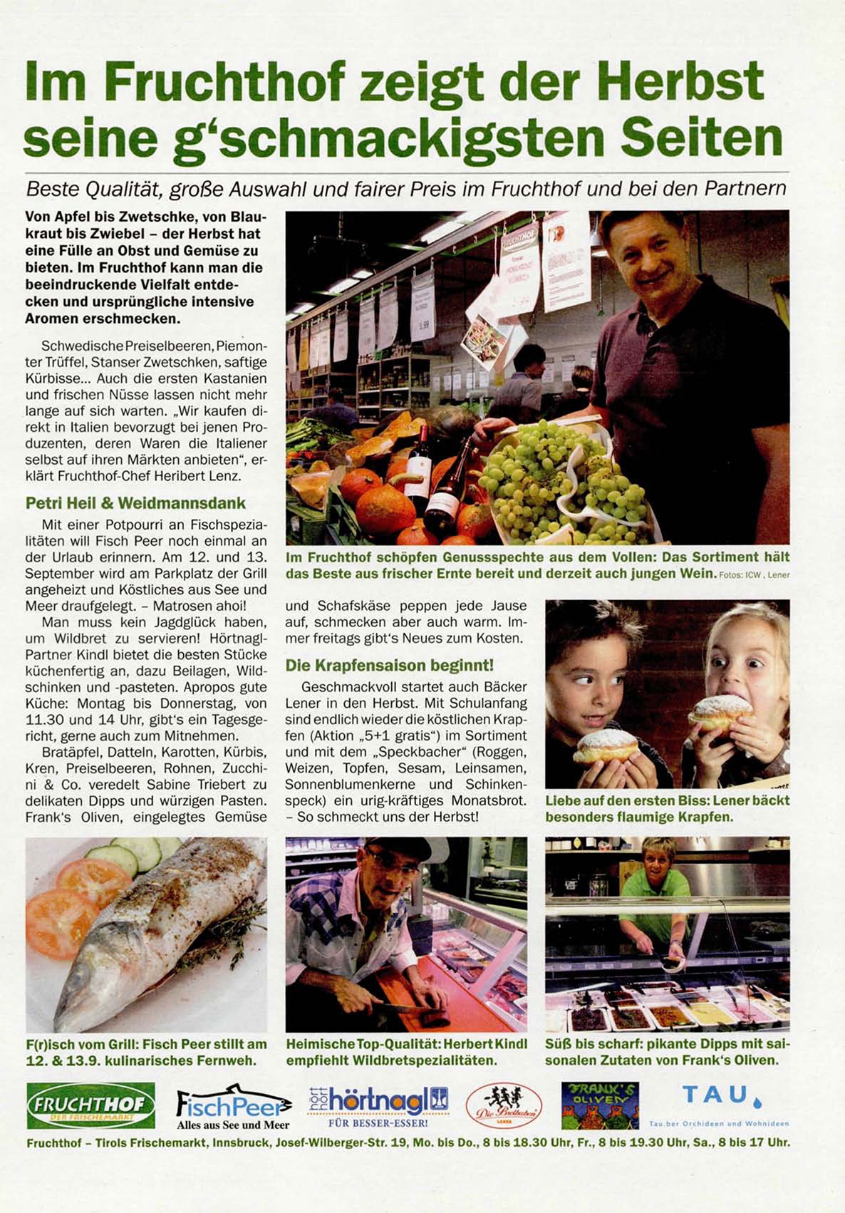 Fruchthof - Tirols Frischemarkt, Innsbruck, Josef-Wilberger-Str. 19, Mo. bis Do., 8 bis 18.30 Uhr, Fr., 8 bis 19.30 Uhr, Sa., 8 bis 17 Uhr.