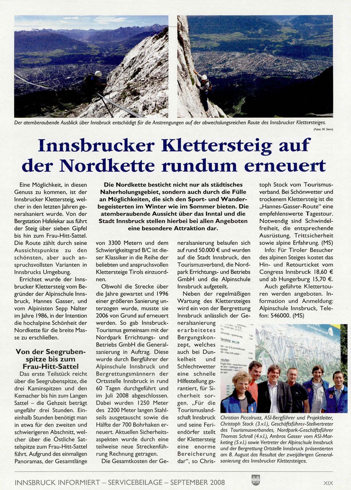 B e r e i c h e r u n g am 8. August das Resultat der zweijährigen Generaldar", so Chris- sanierung des Innsbrucker Klettersteiges.