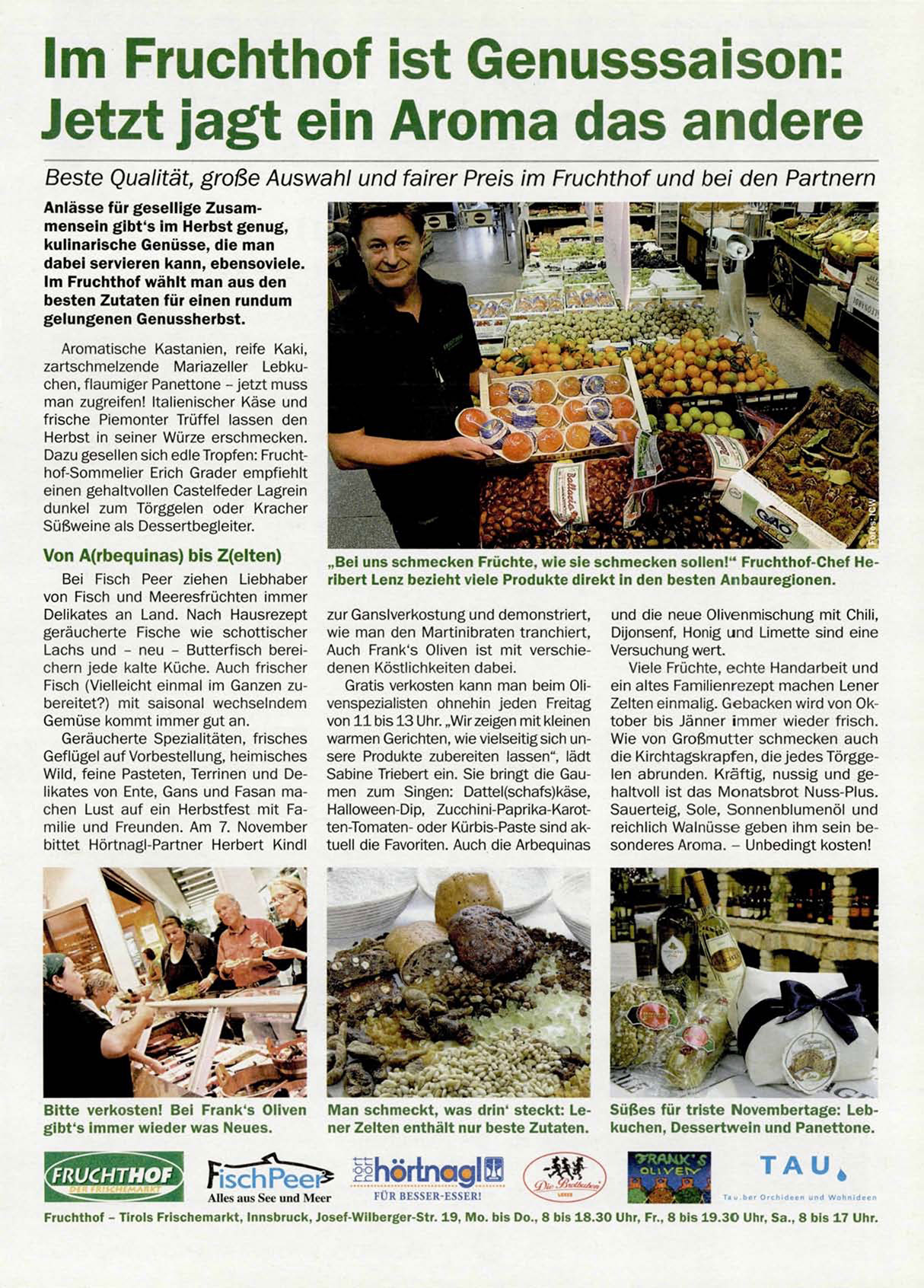 Fruchthof - Tirols Frischemarkt, Innsbruck, Josef-Wilberger-Str. 19, Mo. bis Do., 8 bis 18.30 Uhr, Fr., 8 bis 19.30 Uhr, Sa., 8 bis 17 Uhr.