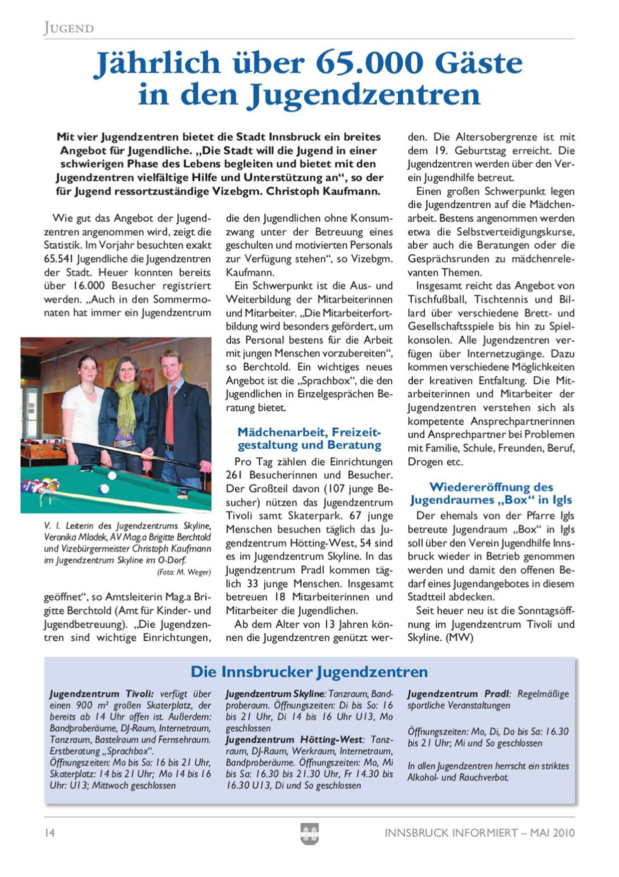 geöffnet“, so Amtsleiterin Mag.a Brigitte Berchtold (Amt für Kinder- und Jugendbetreuung). „Die Jugendzentren sind wichtige Einrichtungen,