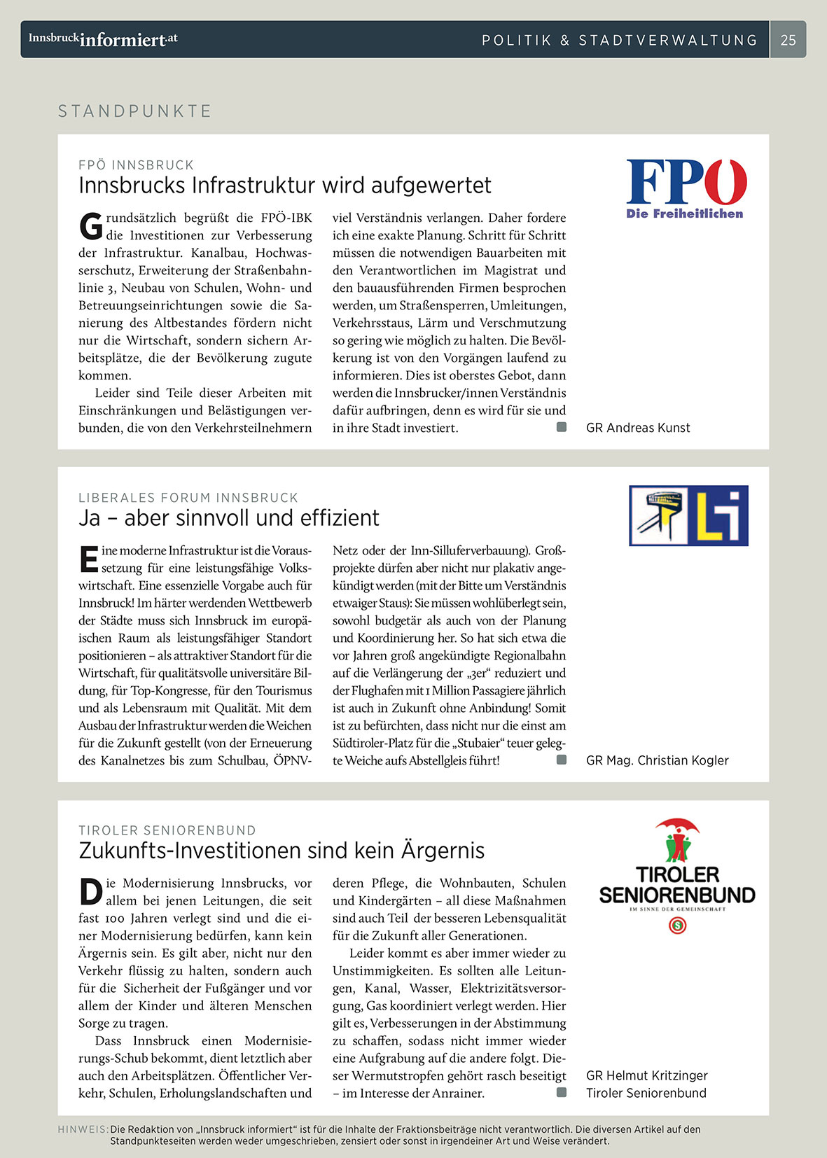 H I N W E I S : Die Redaktion von „Innsbruck informiert“ ist für die Inhalte der Fraktionsbeiträge nicht verantwortlich. Die diversen Artikel auf den