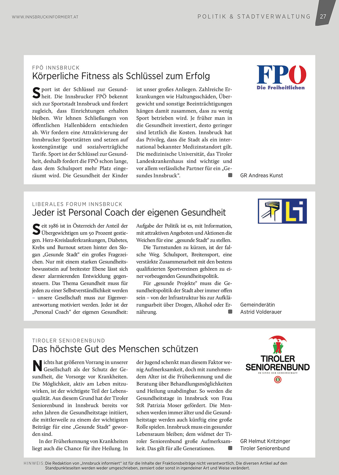 HINWEIS : Die Redaktion von „Innsbruck informiert“ ist für die Inhalte der Fraktionsbeiträge nicht verantwortlich. Die diversen Artikel auf den