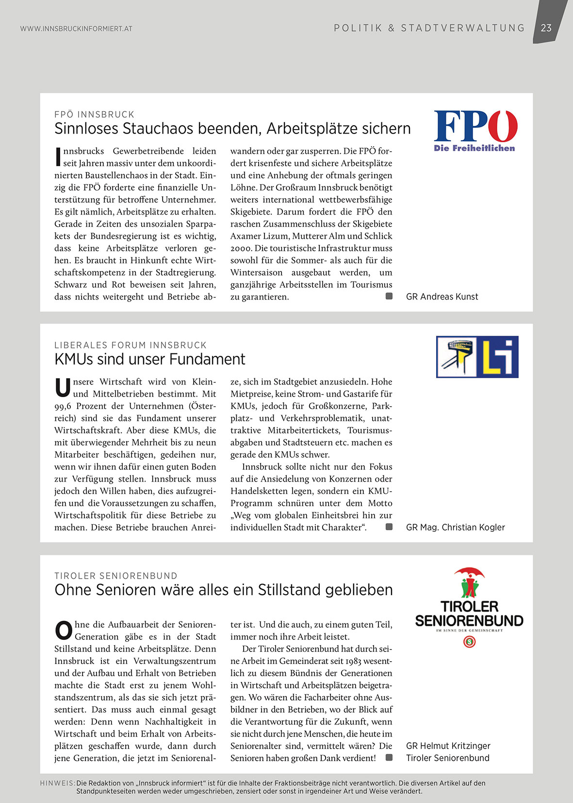 HINWEIS : Die Redaktion von „Innsbruck informiert“ ist für die Inhalte der Fraktionsbeiträge nicht verantwortlich. Die diversen Artikel auf den
