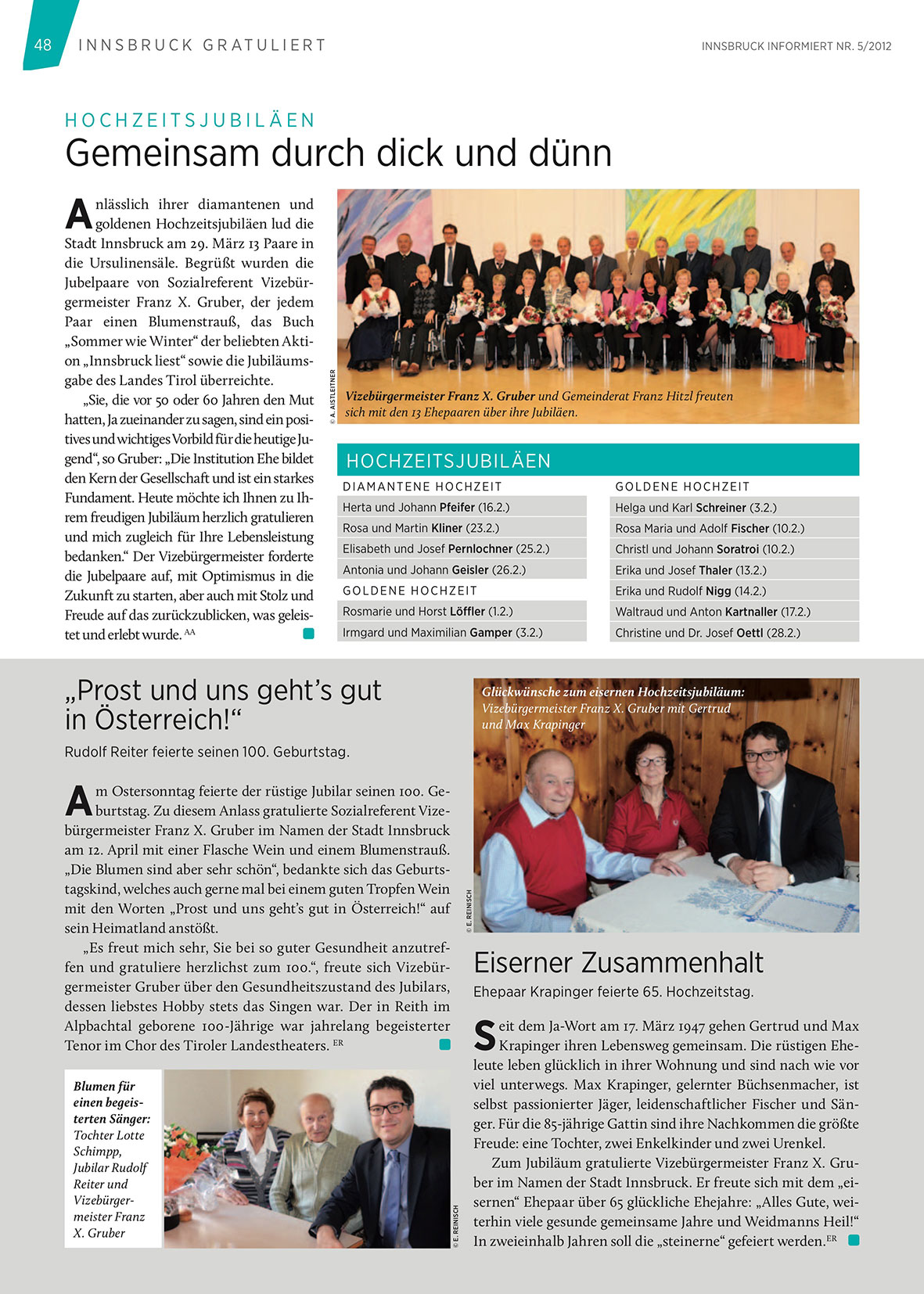 m Ostersonntag feierte der rüstige Jubilar seinen 100. Geburtstag. Zu diesem Anlass gratulierte Sozialreferent Vizebürgermeister Franz X. Gruber im Namen der Stadt Innsbruck