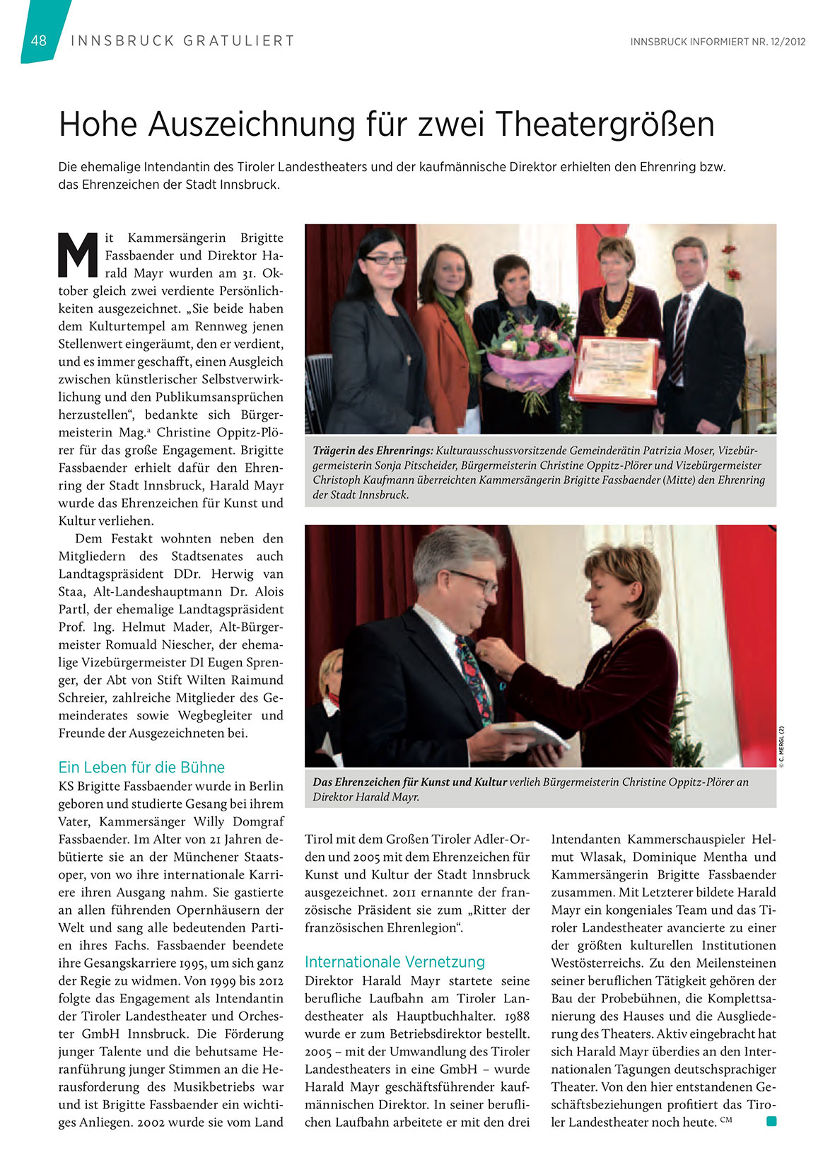 Fassbaender erhielt dafür den Ehrenring der Stadt Innsbruck, Harald Mayr