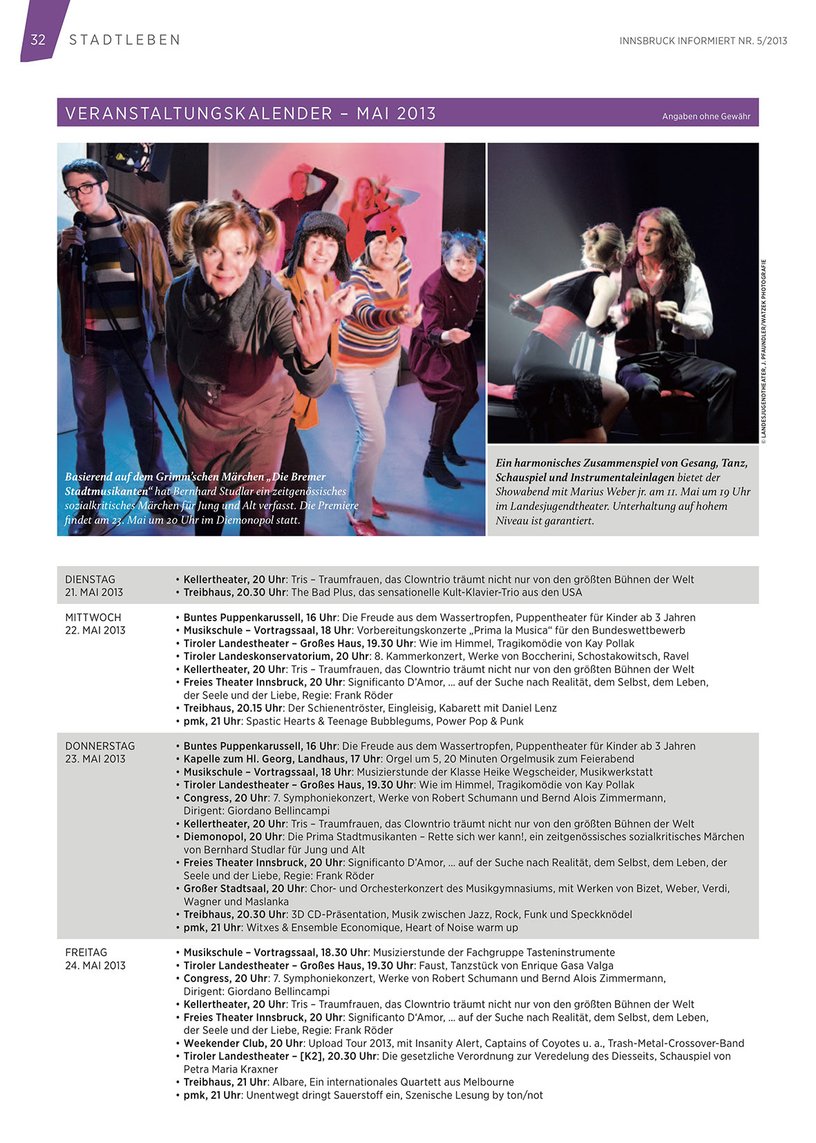 • Kellertheater, 20 Uhr: Tris – Traumfrauen, das Clowntrio träumt nicht nur von den größten Bühnen der Welt