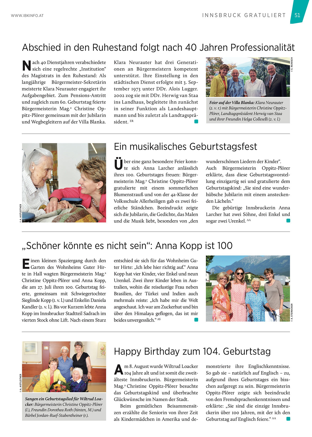 104 Jahre alt und ist somit die zweitälteste Innsbruckerin. Bürgermeisterin