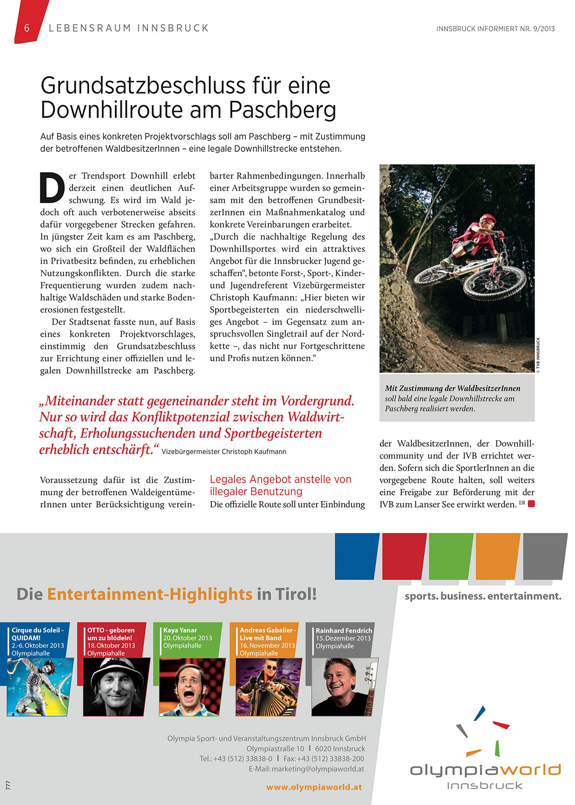 der WaldbesitzerInnen, der Downhillcommunity und der IVB errichtet werden. Sofern sich die SportlerInnen an die