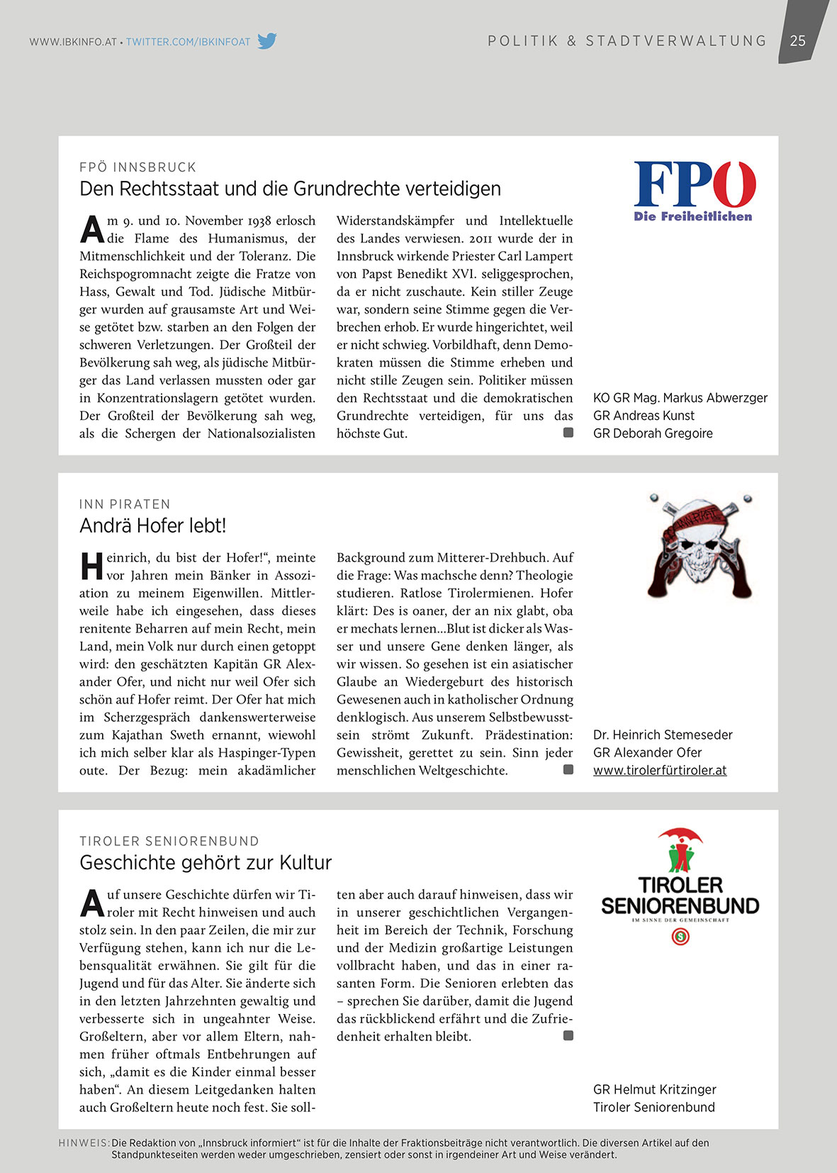 H i n w e i s : Die redaktion von „innsbruck informiert“ ist für die inhalte der fraktionsbeiträge nicht verantwortlich. Die diversen Artikel auf den