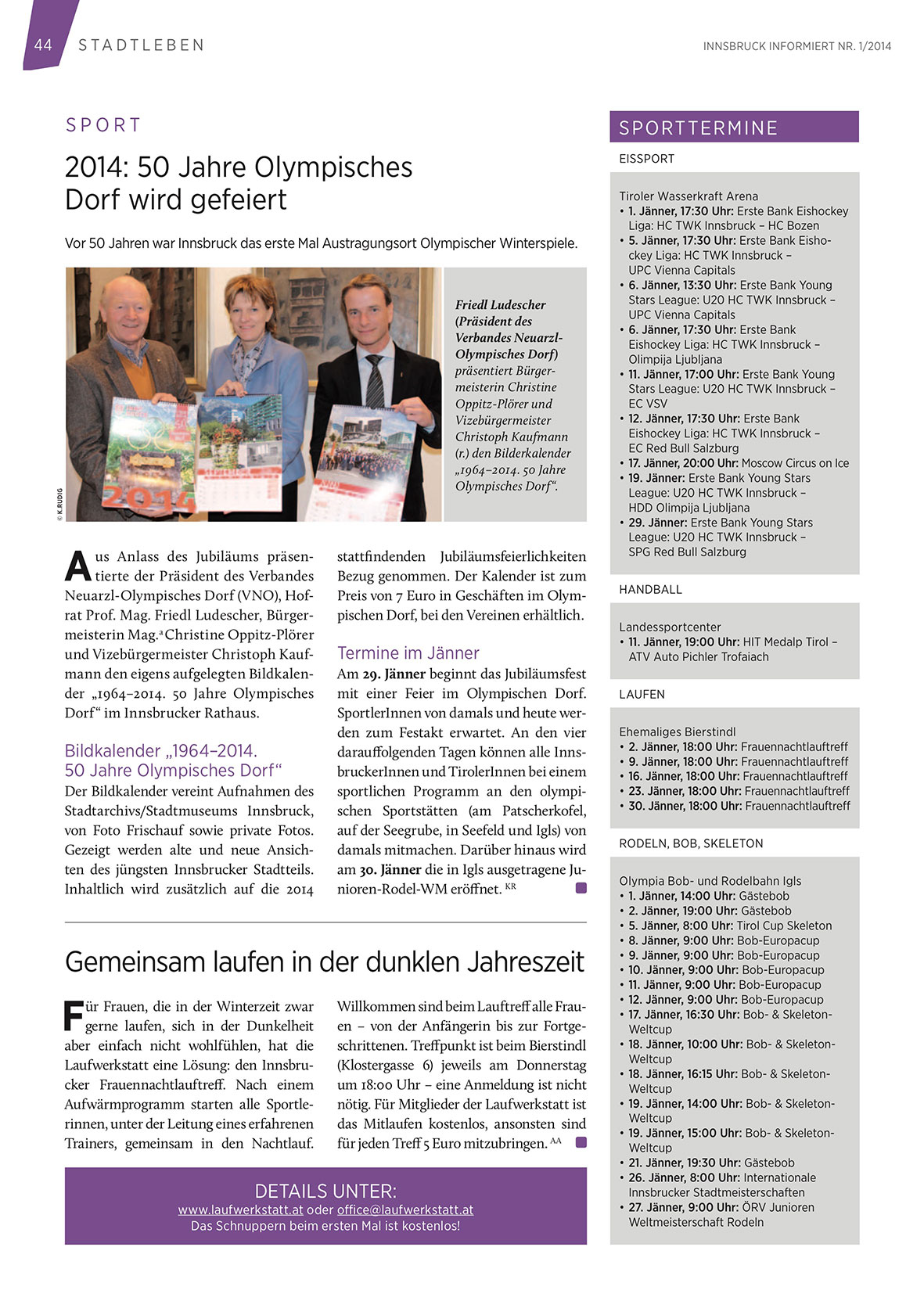 und Vizebürgermeister Christoph Kaufmann den eigens aufgelegten Bildkalender „1964–2014. 50 Jahre Olympisches