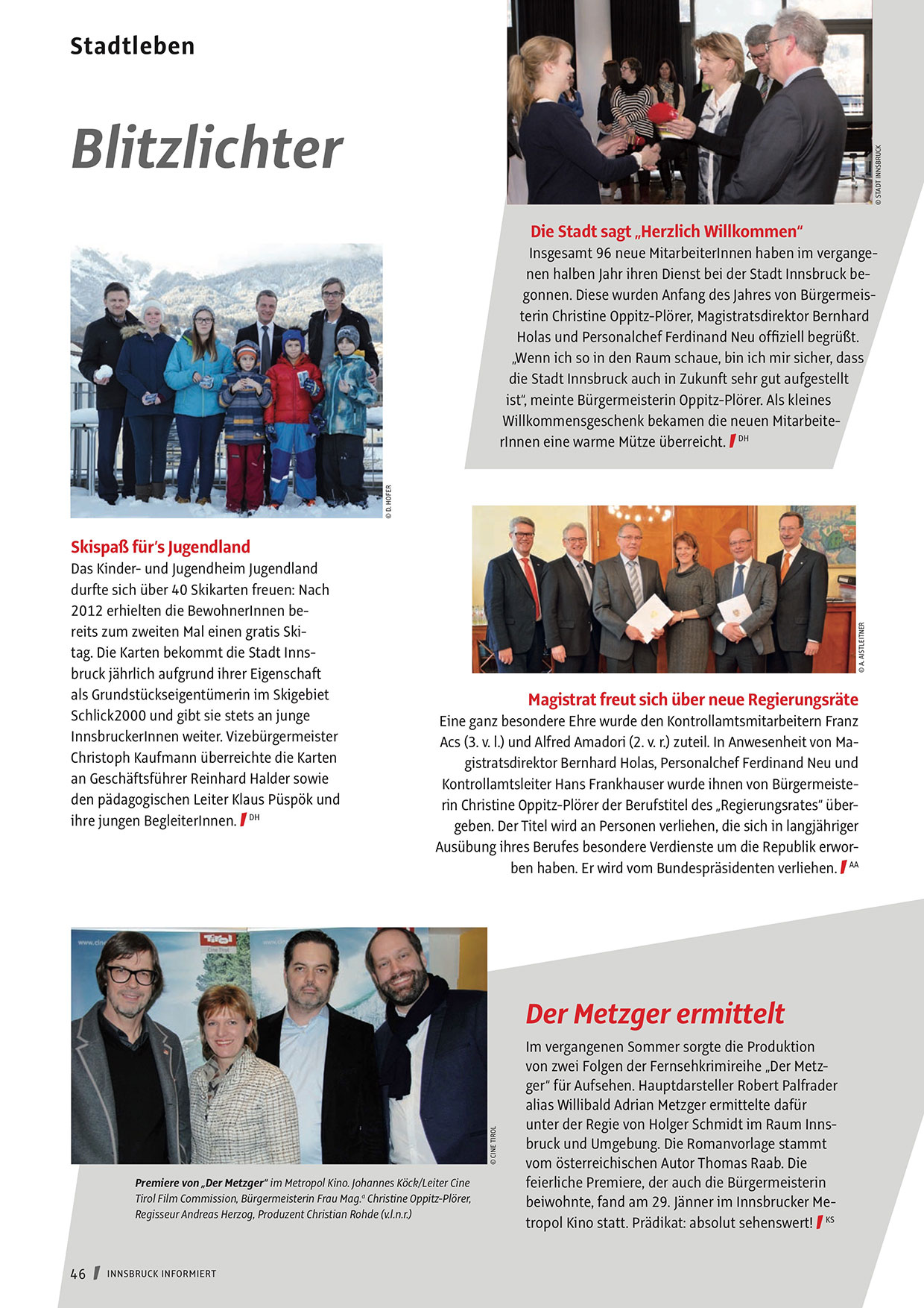 Insgesamt 96 neue MitarbeiterInnen haben im vergangenen halben Jahr ihren Dienst bei der Stadt Innsbruck begonnen. Diese wurden Anfang des Jahres von Bürgermeisterin Christine Oppitz-Plörer, Magistratsdirektor Bernhard