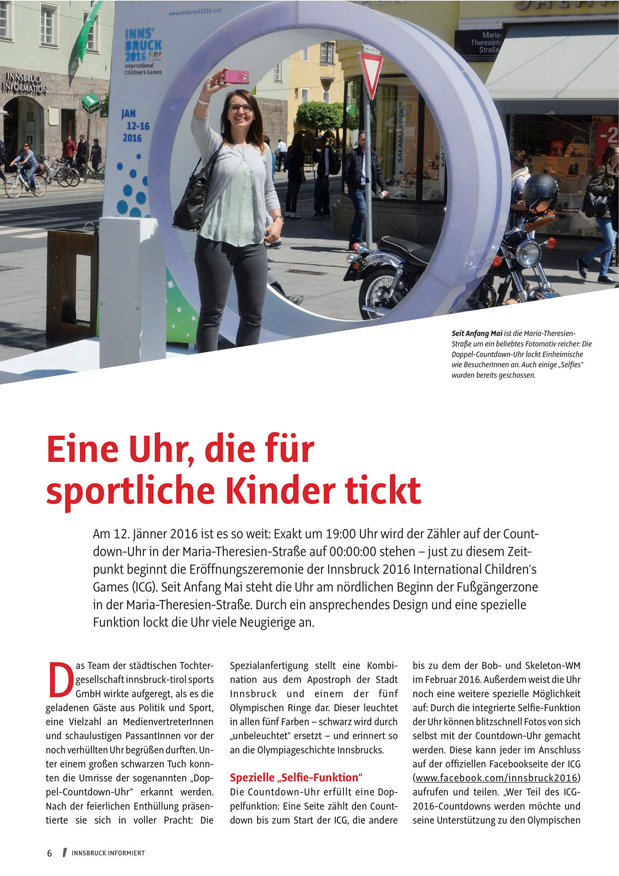 Am 12. Jänner 2016 ist es so weit: Exakt um 19:00 Uhr wird der Zähler auf der Countdown-Uhr in der Maria-Theresien-Straße auf 00:00:00 stehen – just zu diesem Zeitpunkt beginnt die Eröffnungszeremonie der Innsbruck 2016 International Children’s