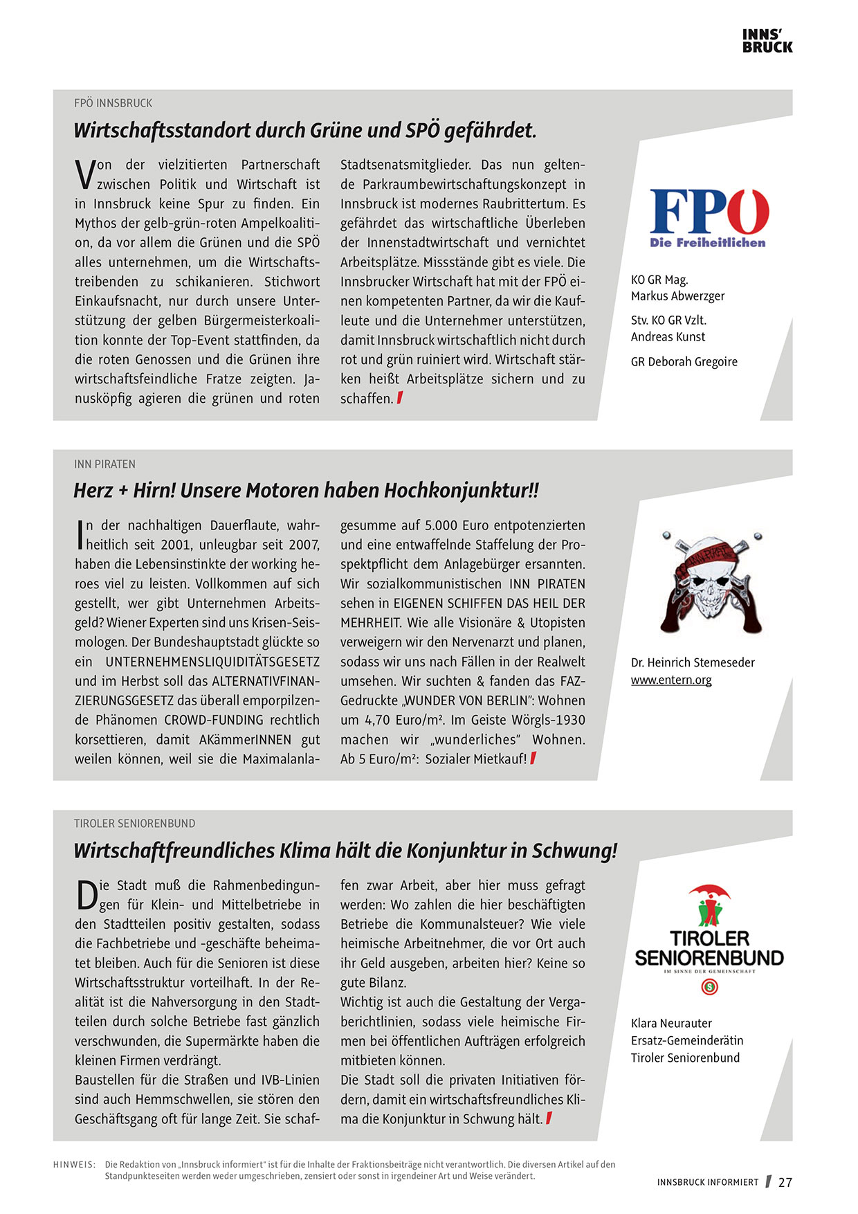 H I N W EI S : Die Redaktion von „Innsbruck informiert“ ist für die Inhalte der Fraktionsbeiträge nicht verantwortlich. Die diversen Artikel auf den