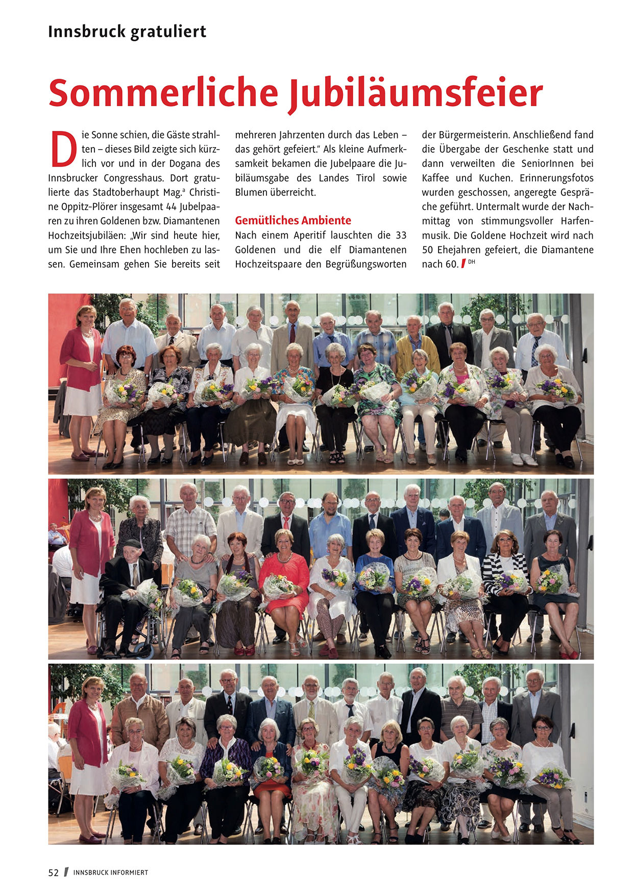 Innsbrucker Congresshaus. Dort gratulierte das Stadtoberhaupt Mag.a Christine Oppitz-Plörer insgesamt 44 Jubelpaaren zu ihren Goldenen bzw. Diamantenen