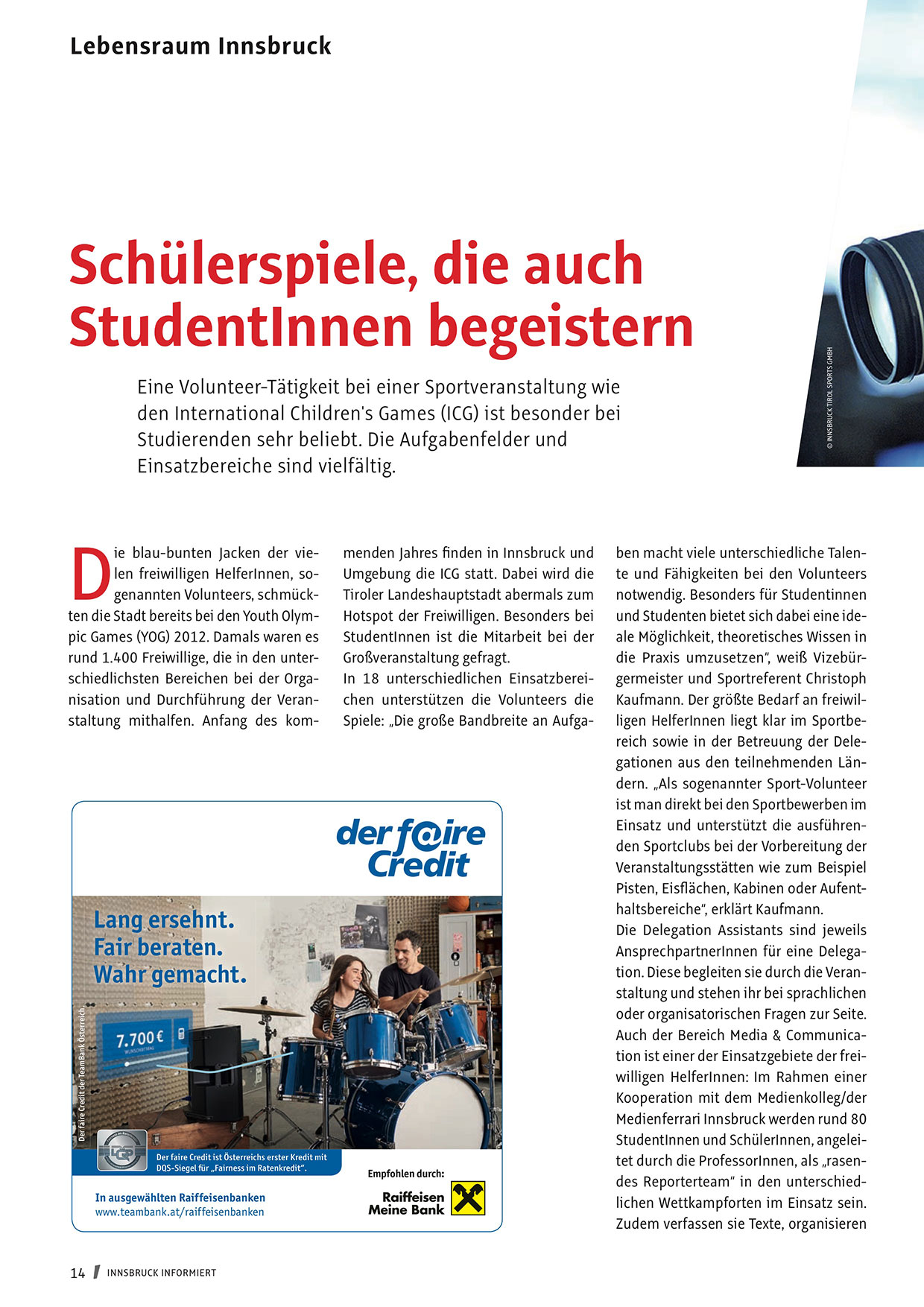 Kaufmann. Der größte Bedarf an freiwilligen HelferInnen liegt klar im Sportbereich sowie in der Betreuung der Delegationen aus den teilnehmenden Ländern. „Als sogenannter Sport-Volunteer