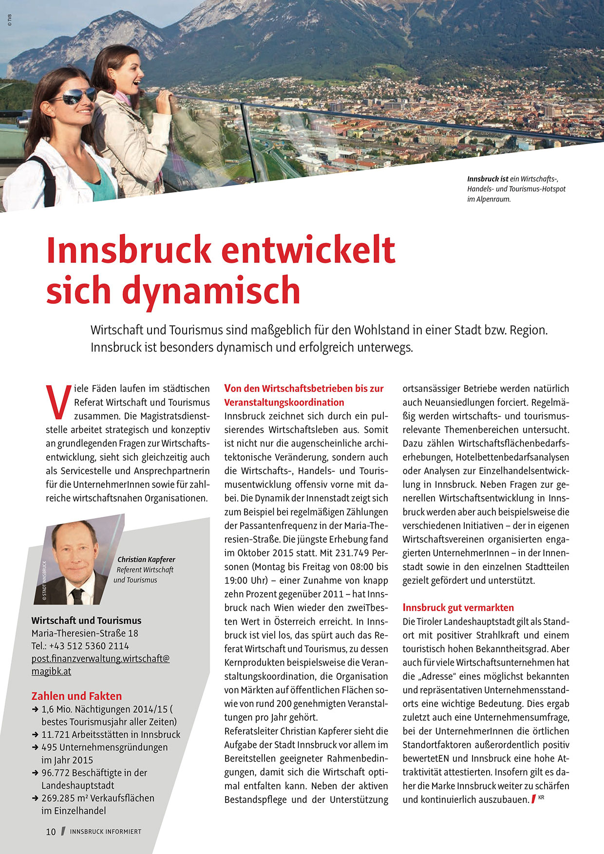 zehn Prozent gegenüber 2011 – hat Innsbruck nach Wien wieder den zweiTbesten Wert in Österreich erreicht. In Innsbruck ist viel los, das spürt auch das Referat Wirtschaft und Tourismus, zu dessen