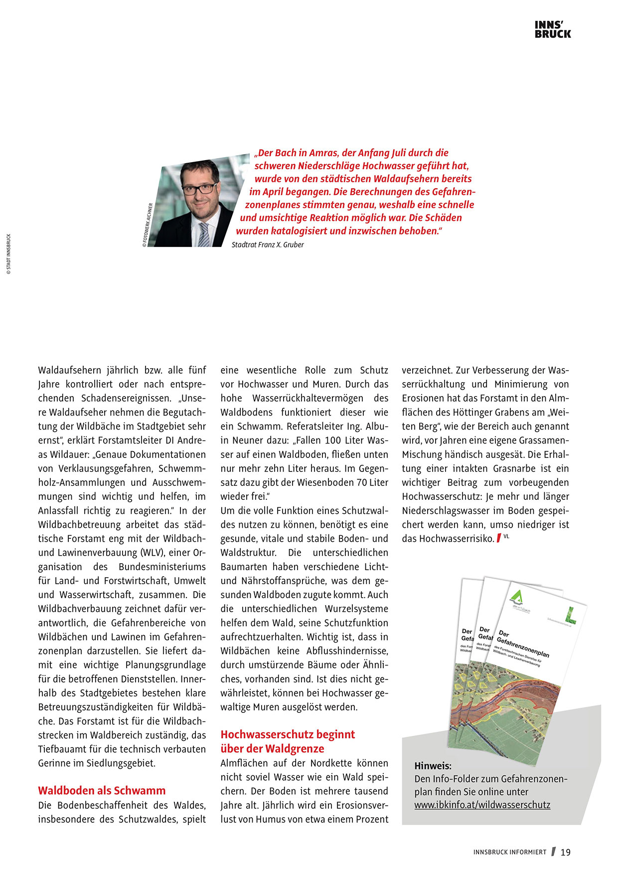 hohe Wasserrückhaltevermögen des Erosionen hat das Forstamt in den AlmWaldbodens funktioniert dieser wie flächen des Höttinger Grabens am „Weiein Schwamm . Referatsleiter Ing . Albu- ten Berg“, wie der Bereich auch genannt