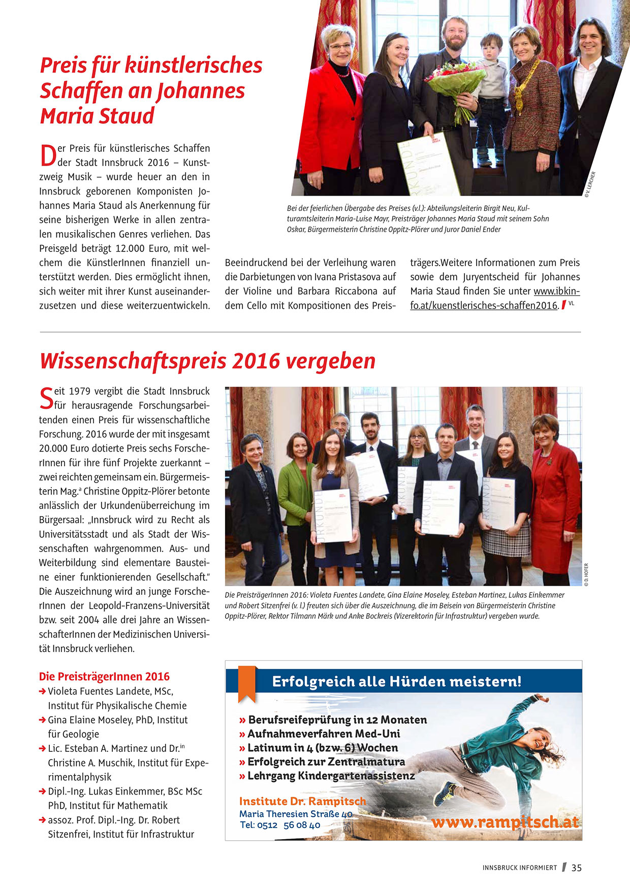 der Stadt Innsbruck 2016 – Kunstzweig Musik – wurde heuer an den in