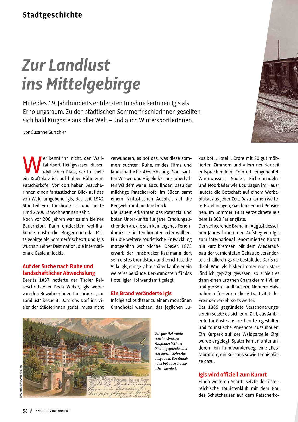 Bauerndorf. Dann entdeckten wohlhabende Innsbrucker BürgerInnen das Mittelgebirge als Sommerfrischeort und Igls
