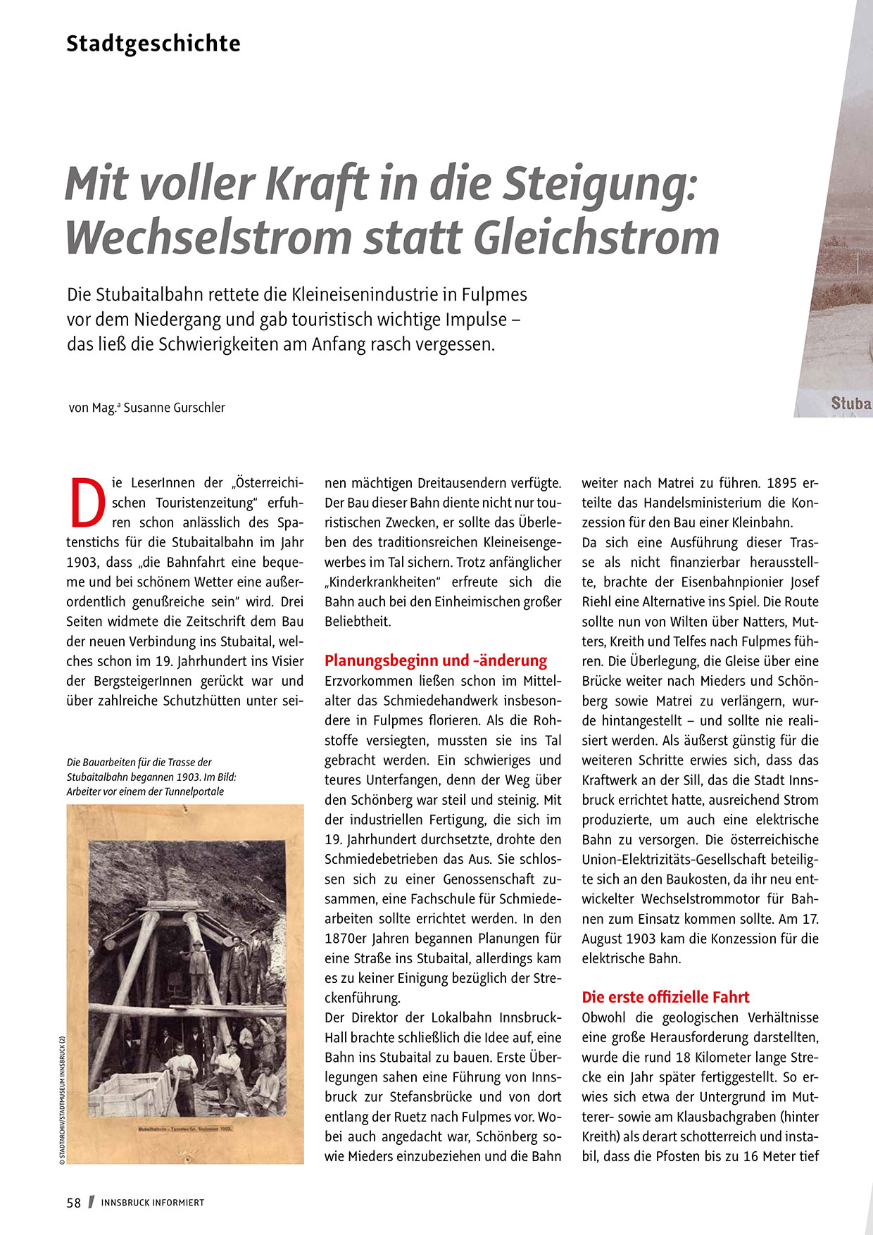 ie LeserInnen der „Österreichischen Touristenzeitung“ erfuhren schon anlässlich des Spatenstichs für die Stubaitalbahn im Jahr