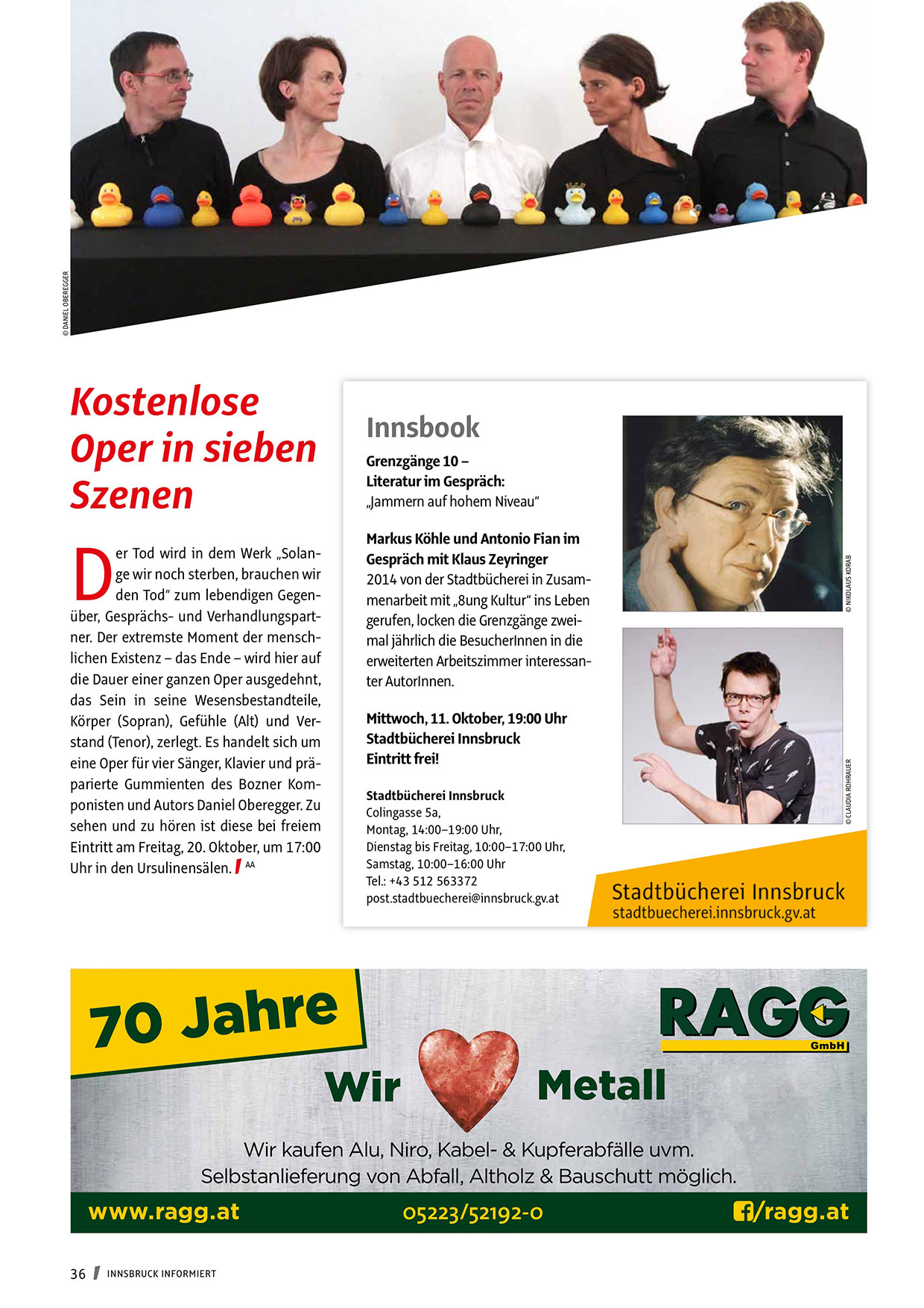 eine Oper für vier Sänger, Klavier und präparierte Gummienten des Bozner Komponisten und Autors Daniel Oberegger. Zu