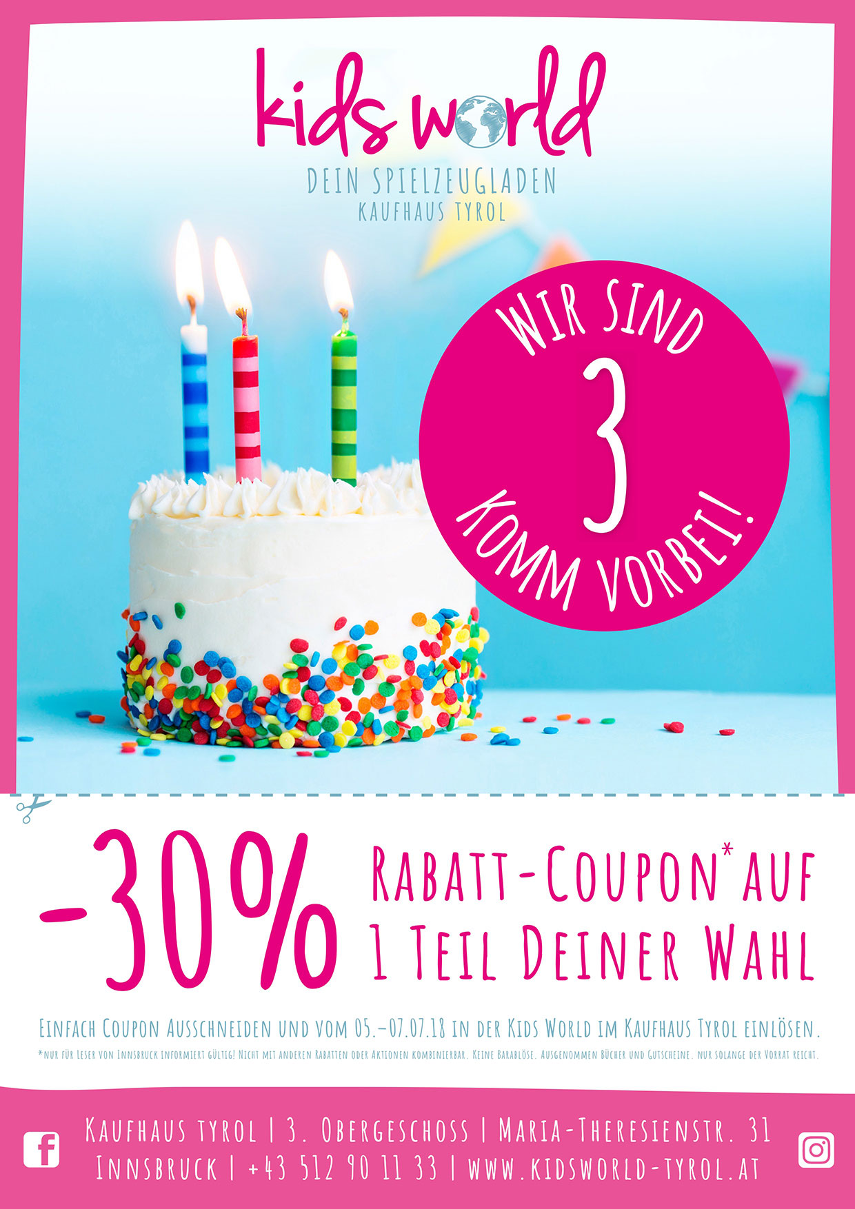 Einfach Coupon Ausschneiden und vom 05.–07.07.18 in der Kids World im Kaufhaus Tyrol einlösen.