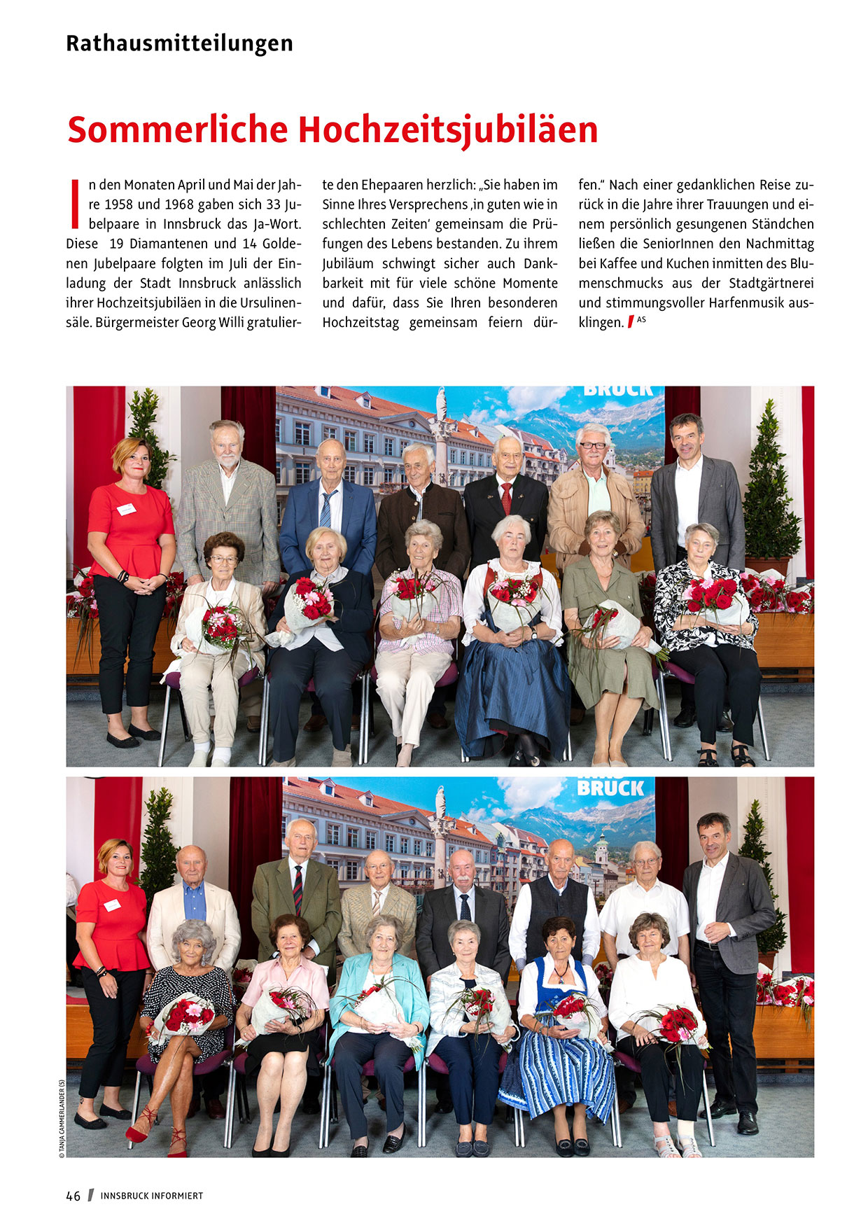 Diese 19 Diamantenen und 14 Goldenen Jubelpaare folgten im Juli der Einladung der Stadt Innsbruck anlässlich