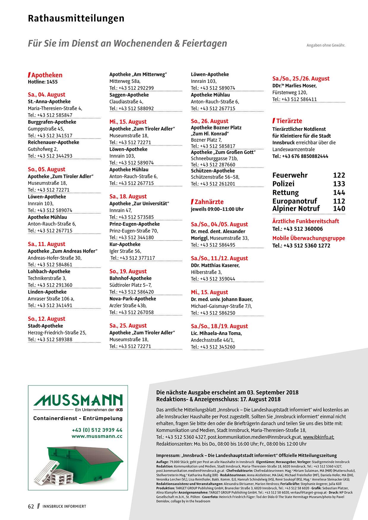 Impressum: „Innsbruck – Die Landeshauptstadt informiert“ Offizielle Mitteilungszeitung