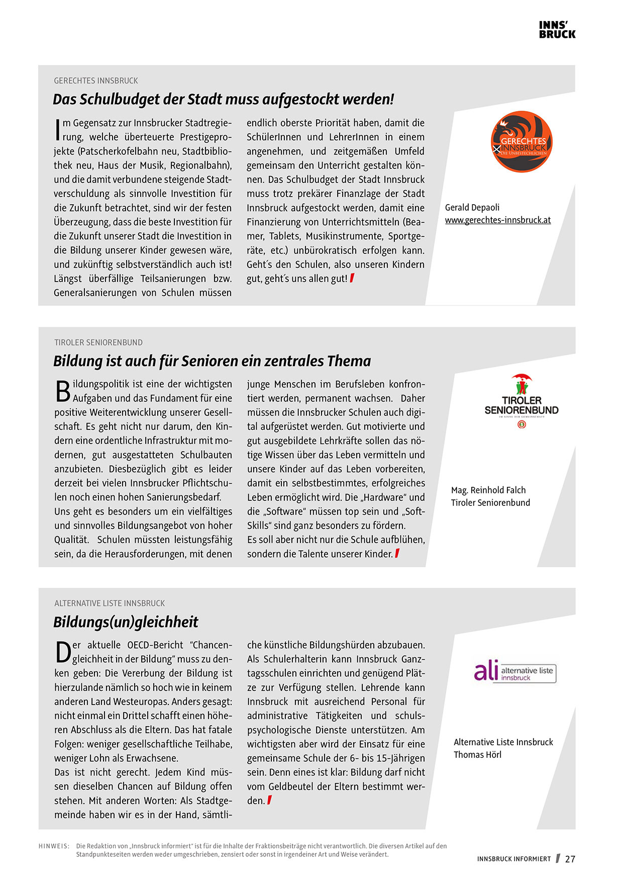 H I N W EI S : Die Redaktion von „Innsbruck informiert“ ist für die Inhalte der Fraktionsbeiträge nicht verantwortlich. Die diversen Artikel auf den
