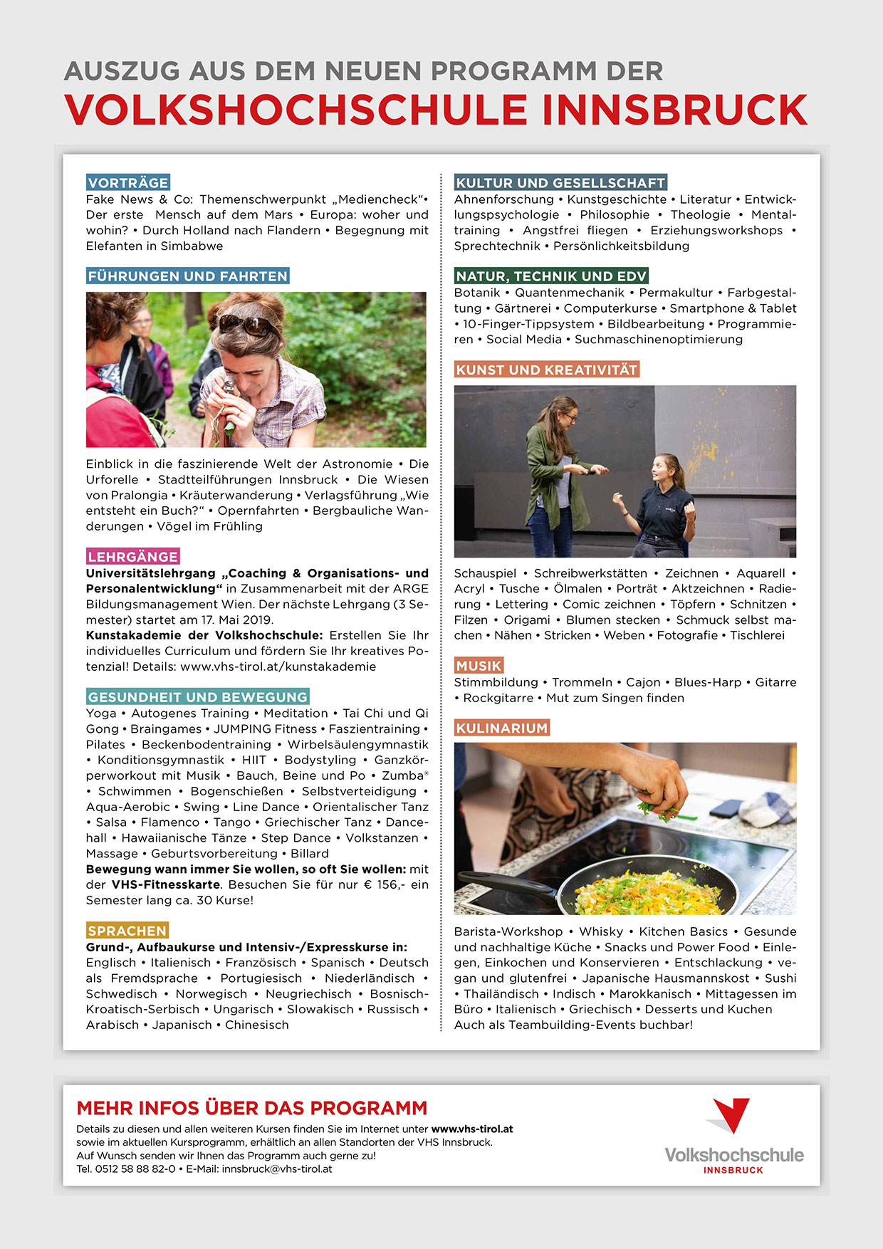 sowie im aktuellen Kursprogramm, erhältlich an allen Standorten der VHS Innsbruck.