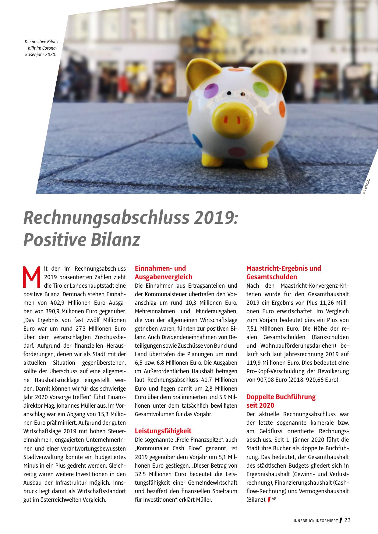 Jahr 2020 Vorsorge treffen“, führt Finanzdirektor Mag. Johannes Müller aus. Im Voranschlag war ein Abgang von 15,3 Millionen Euro präliminiert. Aufgrund der guten