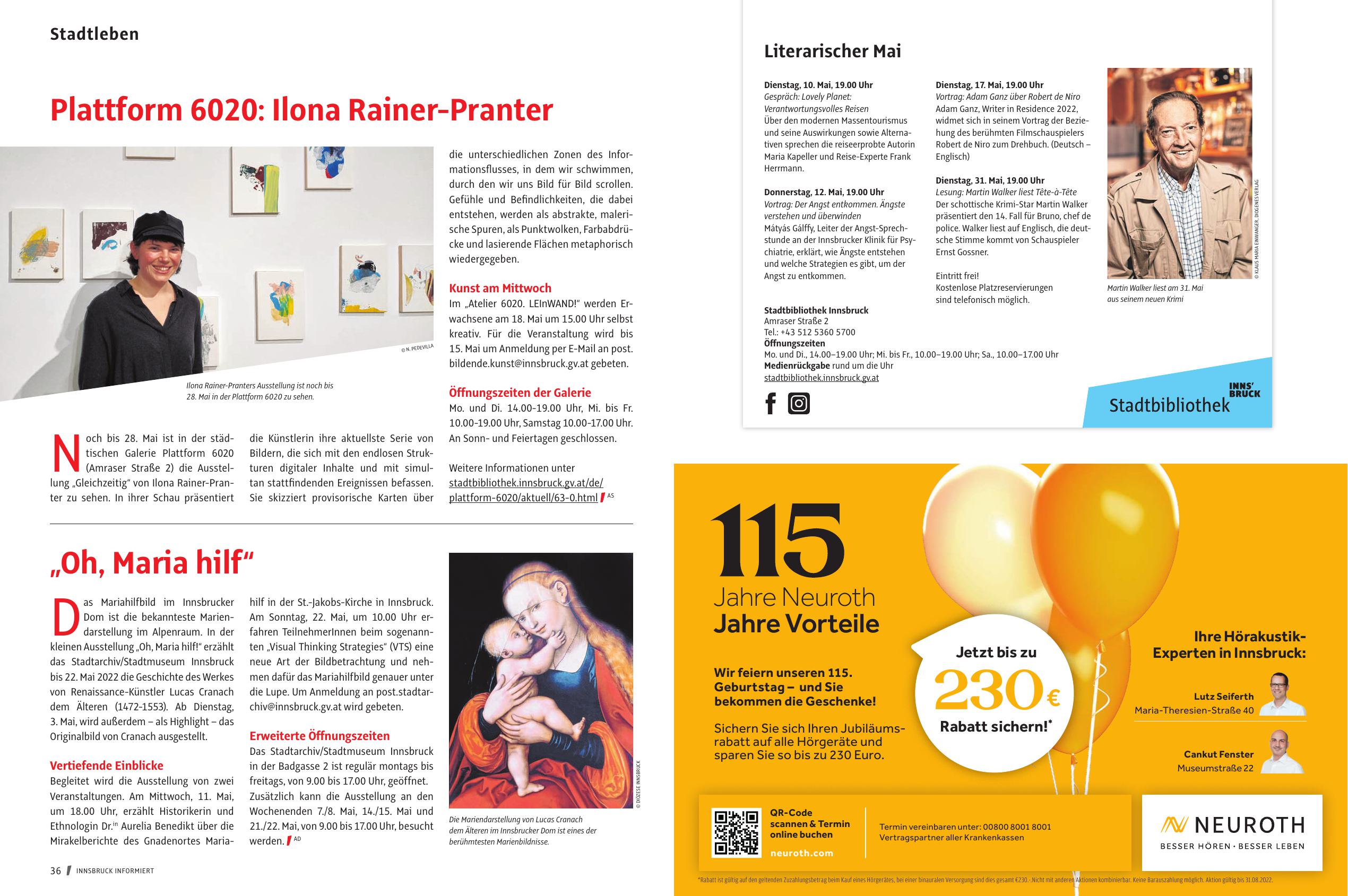 (Amraser Straße 2) die Ausstellung „Gleichzeitig“ von Ilona Rainer-Pranter zu sehen. In ihrer Schau präsentiert