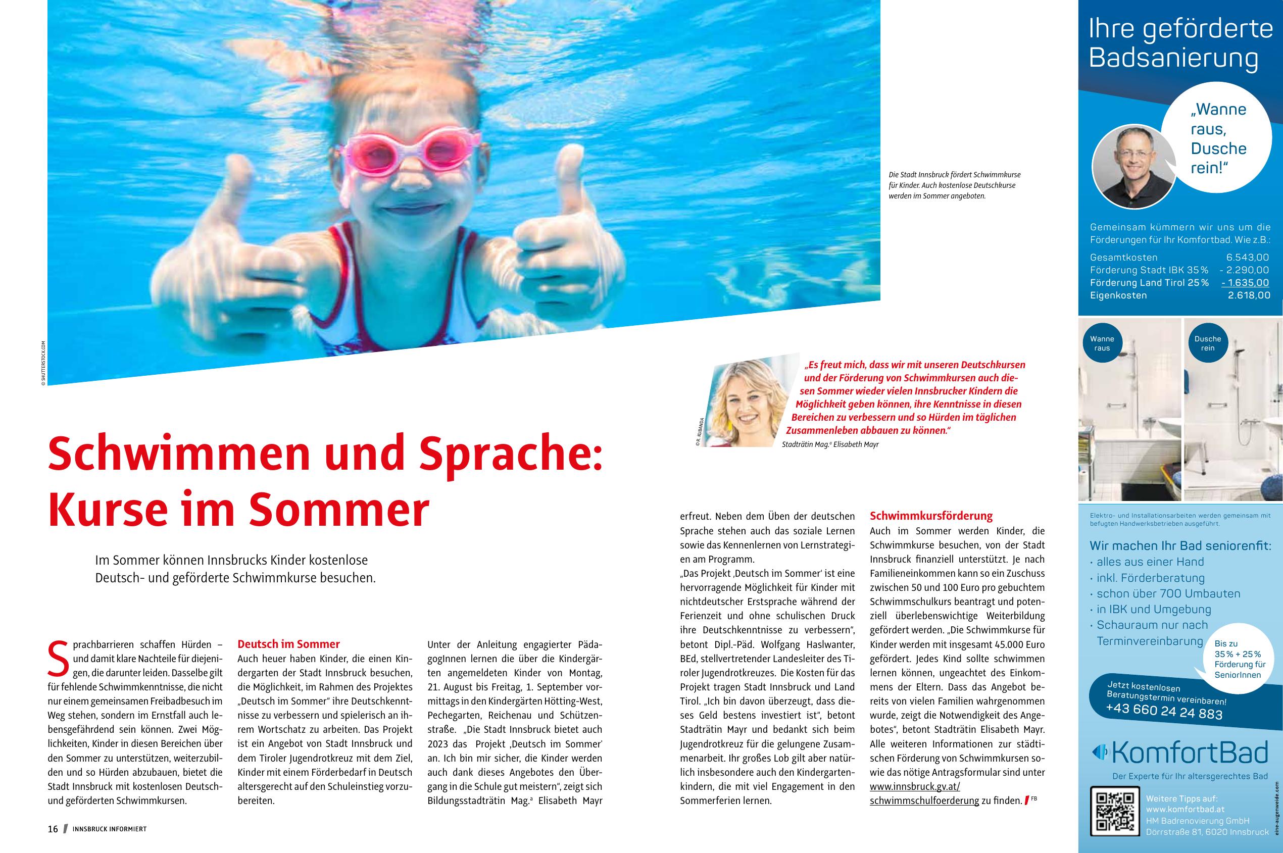Stadt Innsbruck mit kostenlosen Deutschund geförderten Schwimmkursen.