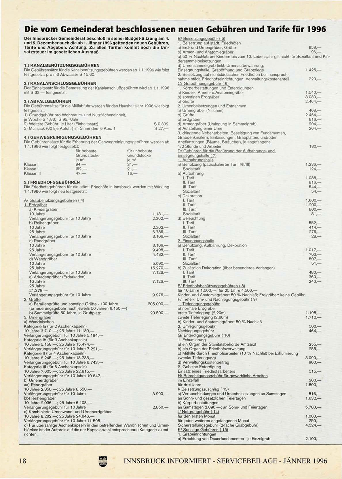 Die vom Gemeinderat beschlossenen neuen Gebühren und Tarife für 1996