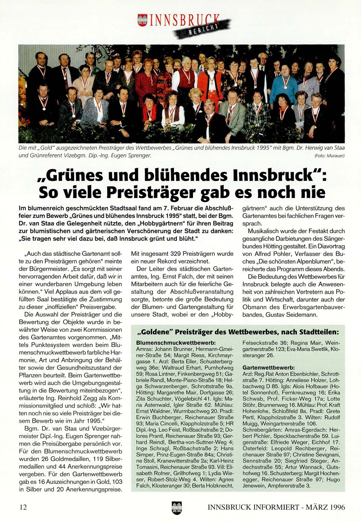 Im blumenreich geschmückten Stadtsaal fand am 7. Februar die Abschlußfeier zum Bewerb „Grünes und blühendes Innsbruck 1995" statt, bei der Bgm.