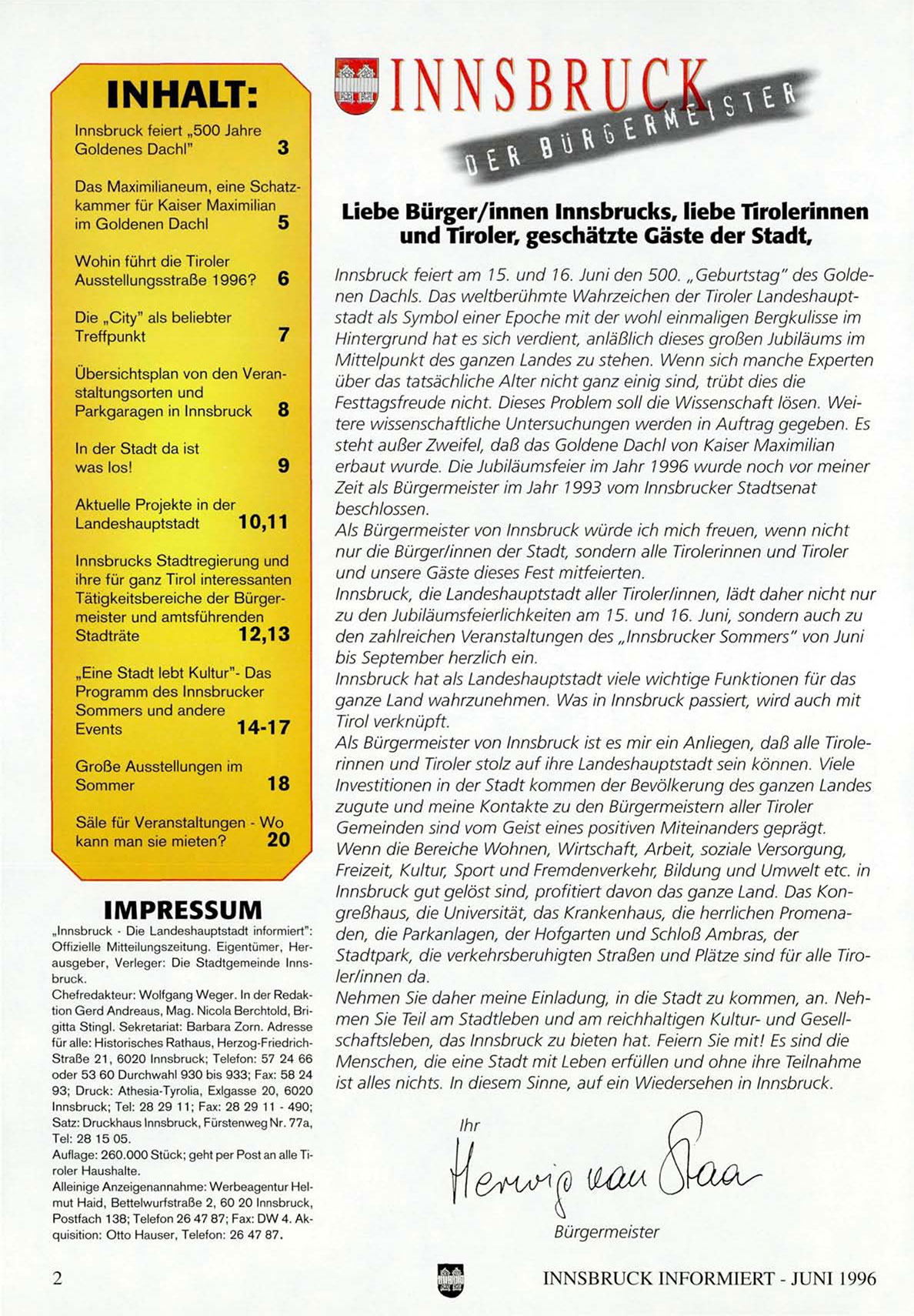 Als Bürgermeister von Innsbruck ist es mir ein Anliegen, daß alle Tirolerinnen und Tiroler stolz auf ihre Landeshauptstadt sein können. Viele