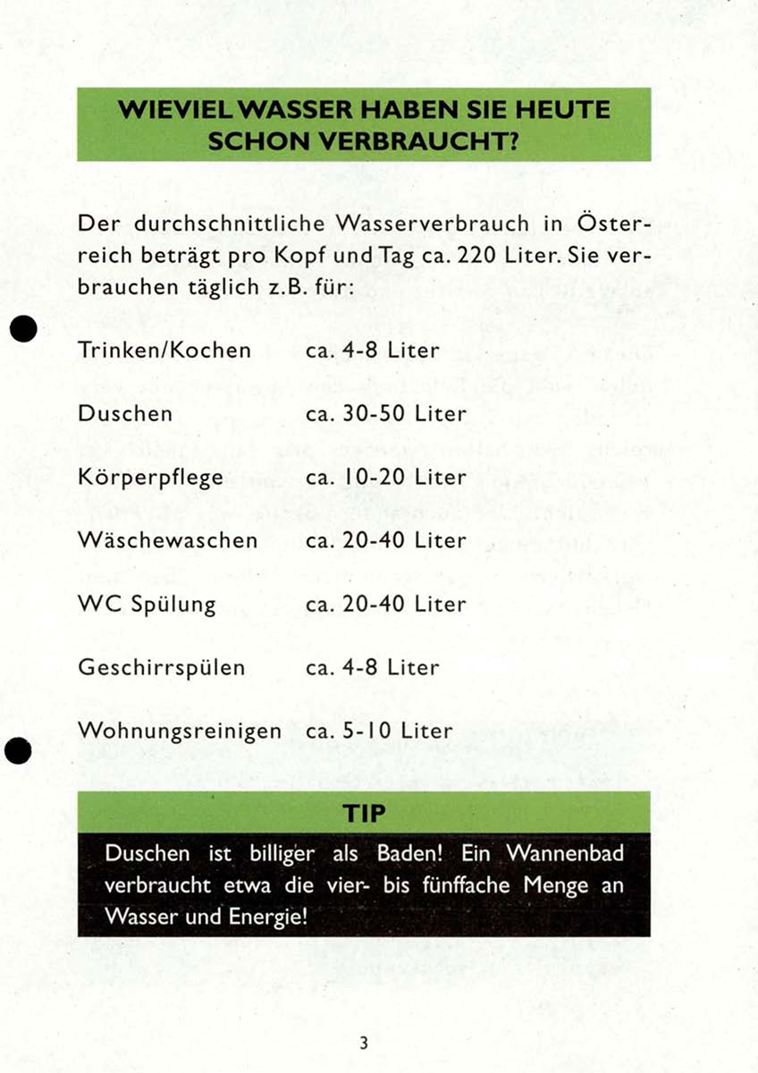 Der durchschnittliche Wasserverbrauch in Österreich beträgt pro Kopf und Tag ca. 220 Liter. Sie verbrauchen täglich z.B. für: