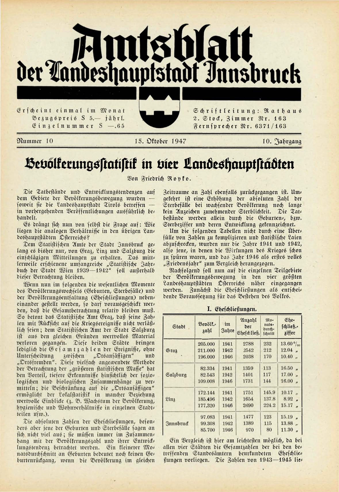 Dem Statistischen Amte der Stadt Innsbruck gelang es bisher nur, von Graz, Linz und Salzburg die