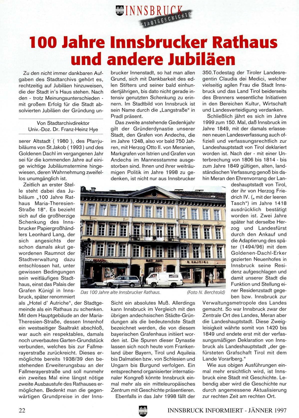 Wie aus obigen Ausführungen einmal mehr ersichtlich wird, ist Innsbruck eine Stadt mit Geschichte. Lebendig aber wird die Geschichte nur